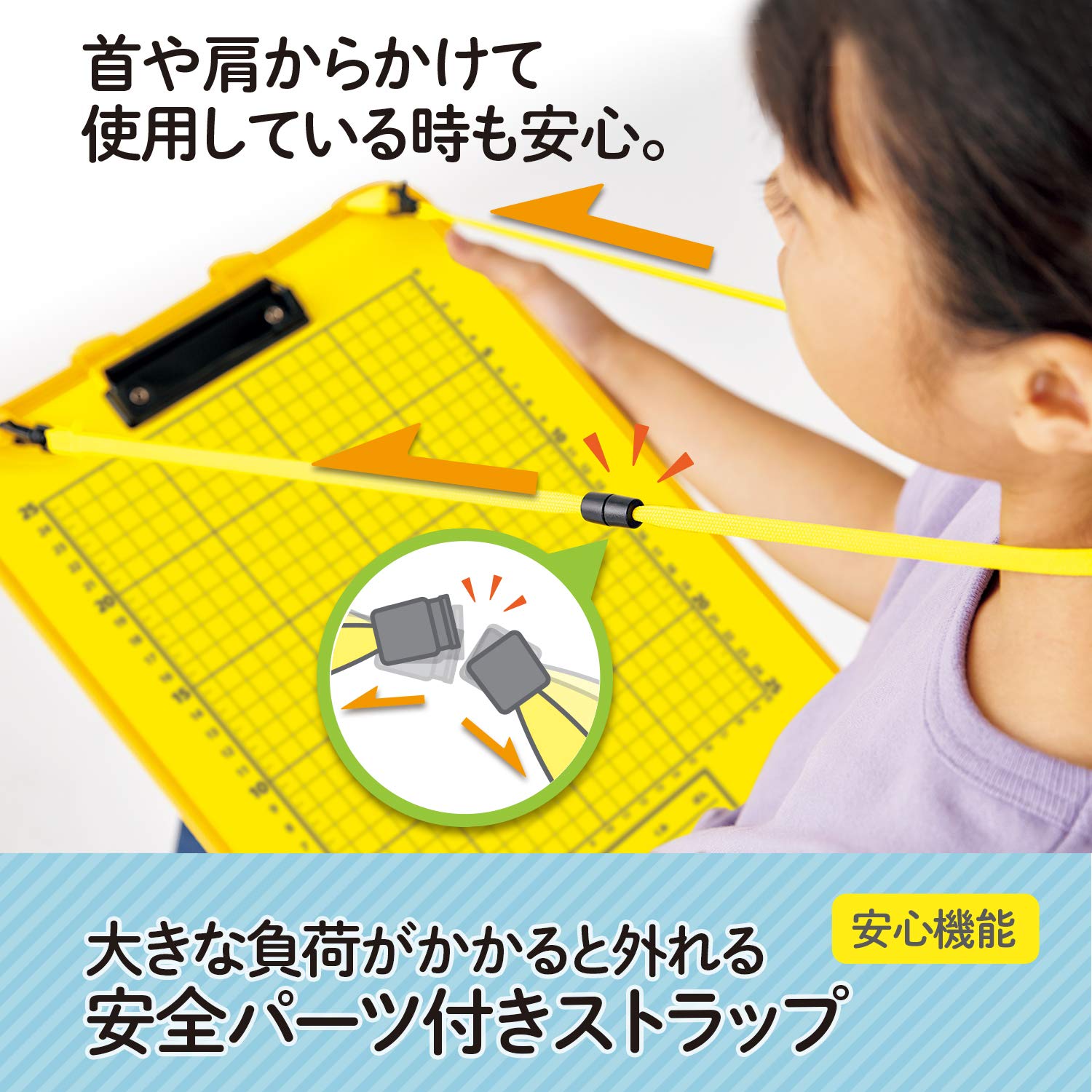 ・肩や首から下げて使用できるストラップ付き。ストラップには安全パーツが付いており、首に大きな負荷がかかると外れる仕組みになっています。安心して使用することができます。
