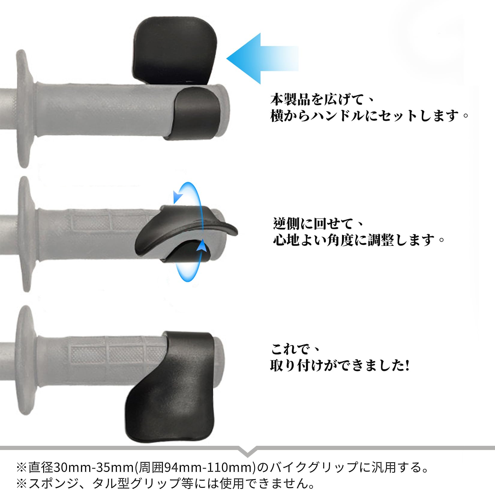 アクセルハンドル直径30mm-35mm(周囲94mm-110mm)のオートバイや電動自転車及びキックボードに汎用する。取り付け時は開口部をゆっくり広げてからアクセルハンドルに挟みます。