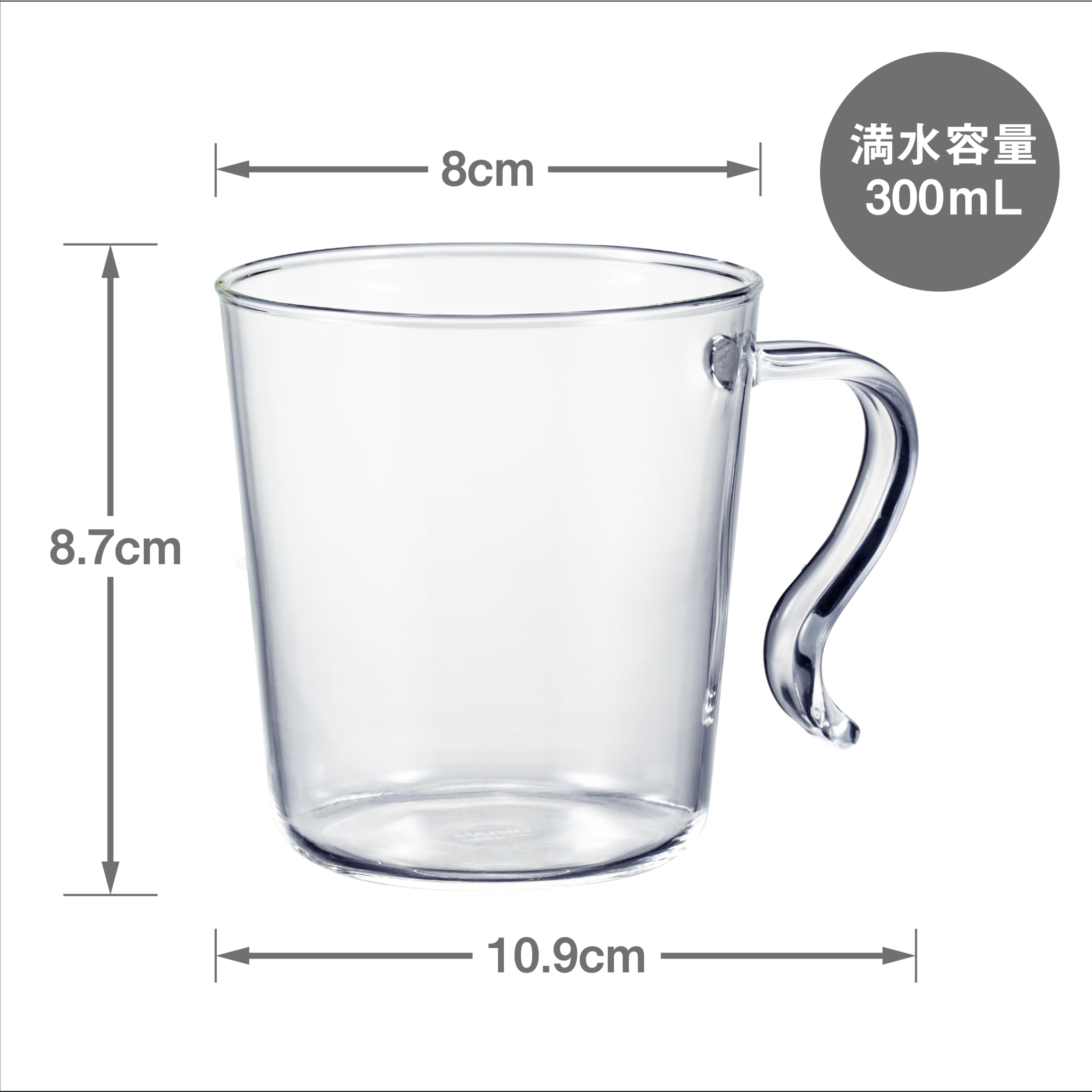 【商品詳細】本体サイズ:幅10.9×奥行8.0×高さ8.7cm、本体重量:約100g、2個セット、満水容量:300mL、本体材質:耐熱ガラス、日本製