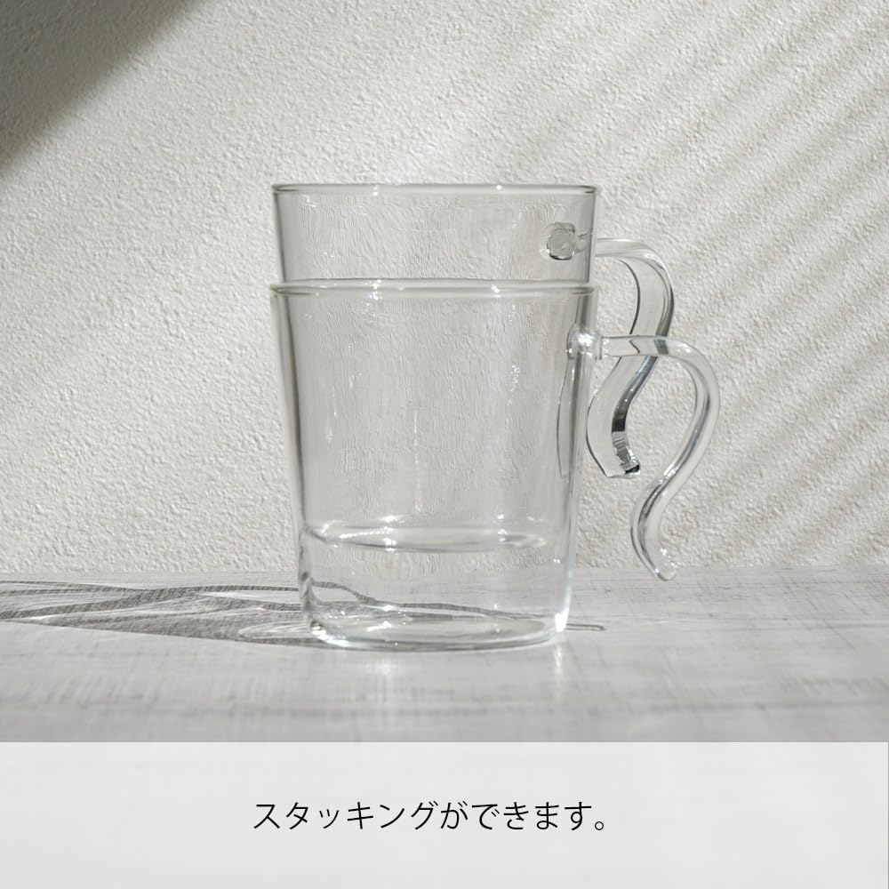スタッキングできる耐熱ガラス製マグカップ。取っ手の形状を工夫し、スタッキングできるようになりました。重ねて収納できるので省スペース。耐熱ガラス製で電子レンジOK。温かい飲み物にも冷たい飲み物にもお使いいただけます。