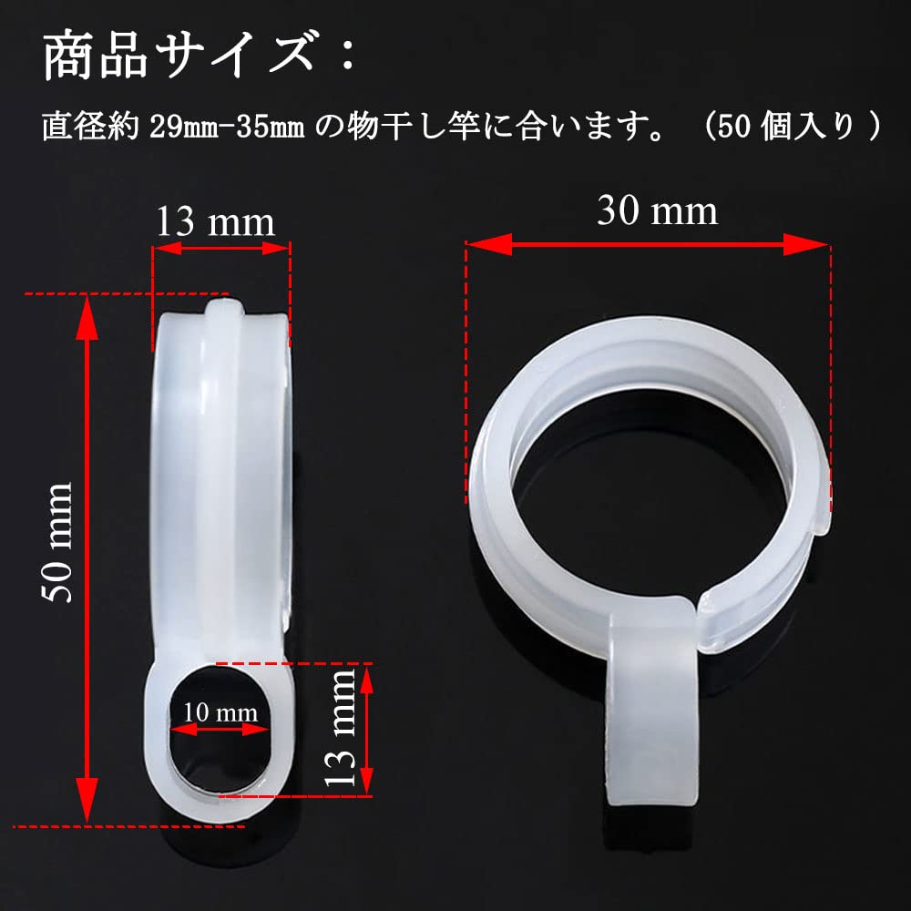 【商品仕様】数:50枚入れ 色:半透明。無臭、無害、耐老化のプラスチックを採用してので、非常に丈夫で耐久性があり、壊れたり変形したりしにくく、長期使用が可能です。直径約29mm-35mmの物干し竿に合います。