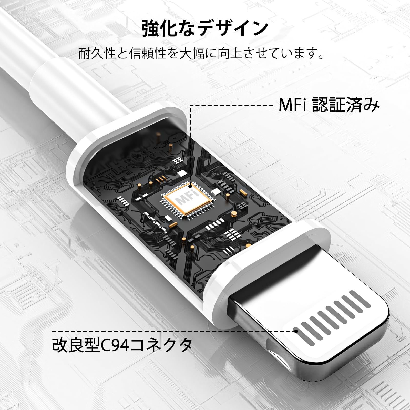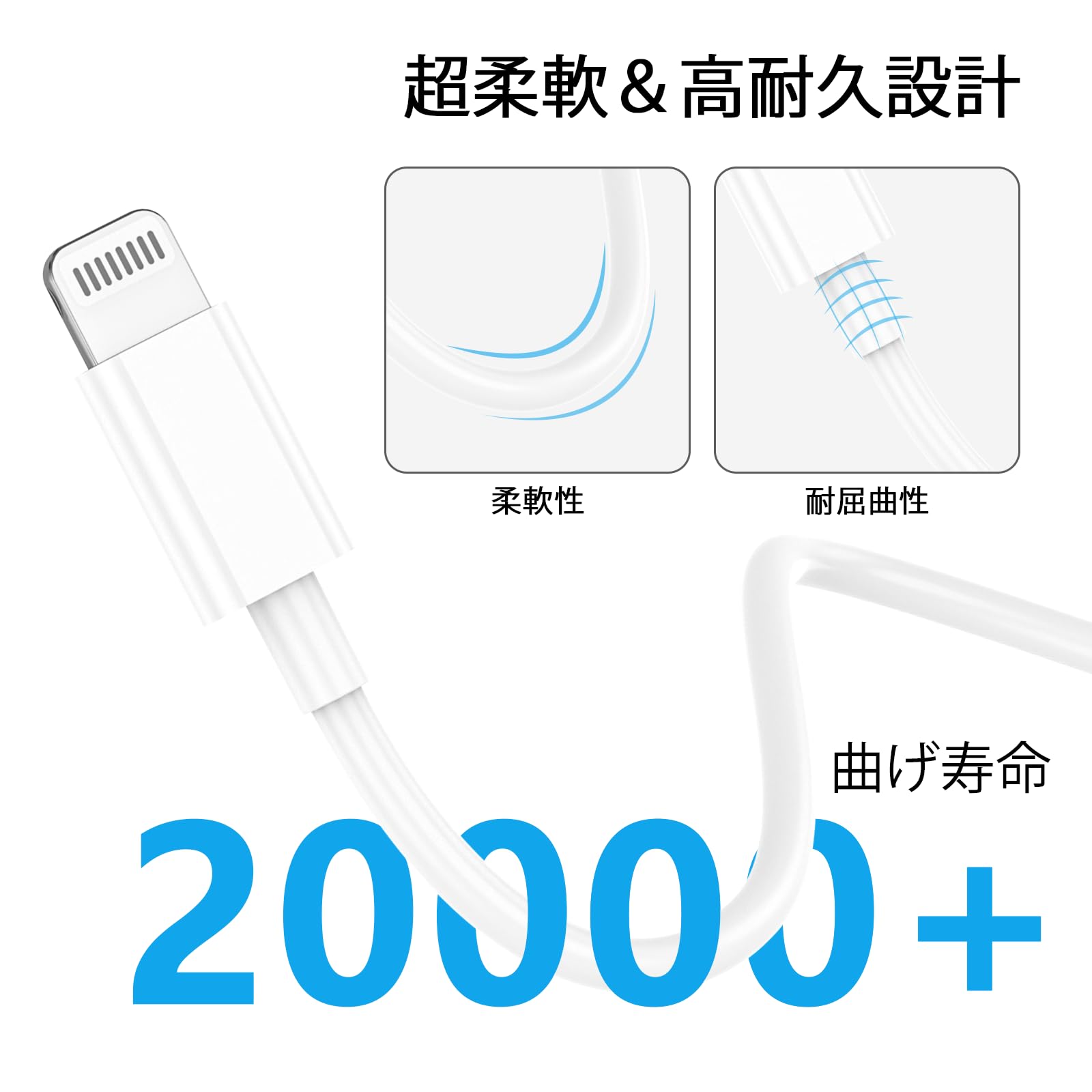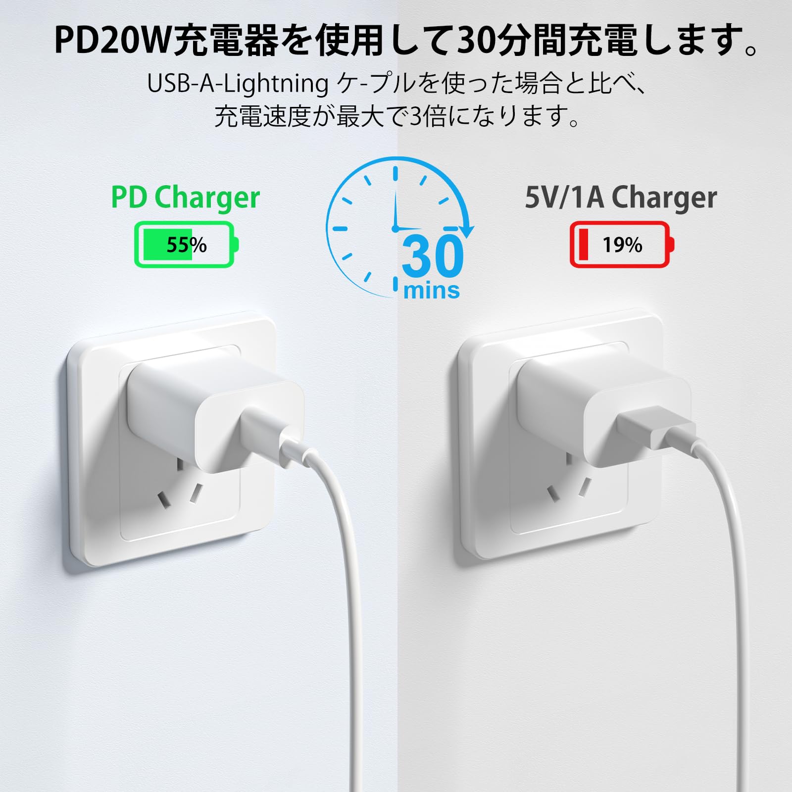 【PD 20W高速充電&データ転送対応】このライトニングケーブルは高品質な銅線を採用しておりますため、PD規格による最大20Wの急速充電(約30分で50%充電)と480Mbpsの高速データ転送が可能でございます。最大3A/20Wの大電流にも対応しておりまして、一般的なケーブルと比較しますと約3倍の速さで充電可能となっております。忙しい毎日でも、素早く効率的な充電をお約束いたします。