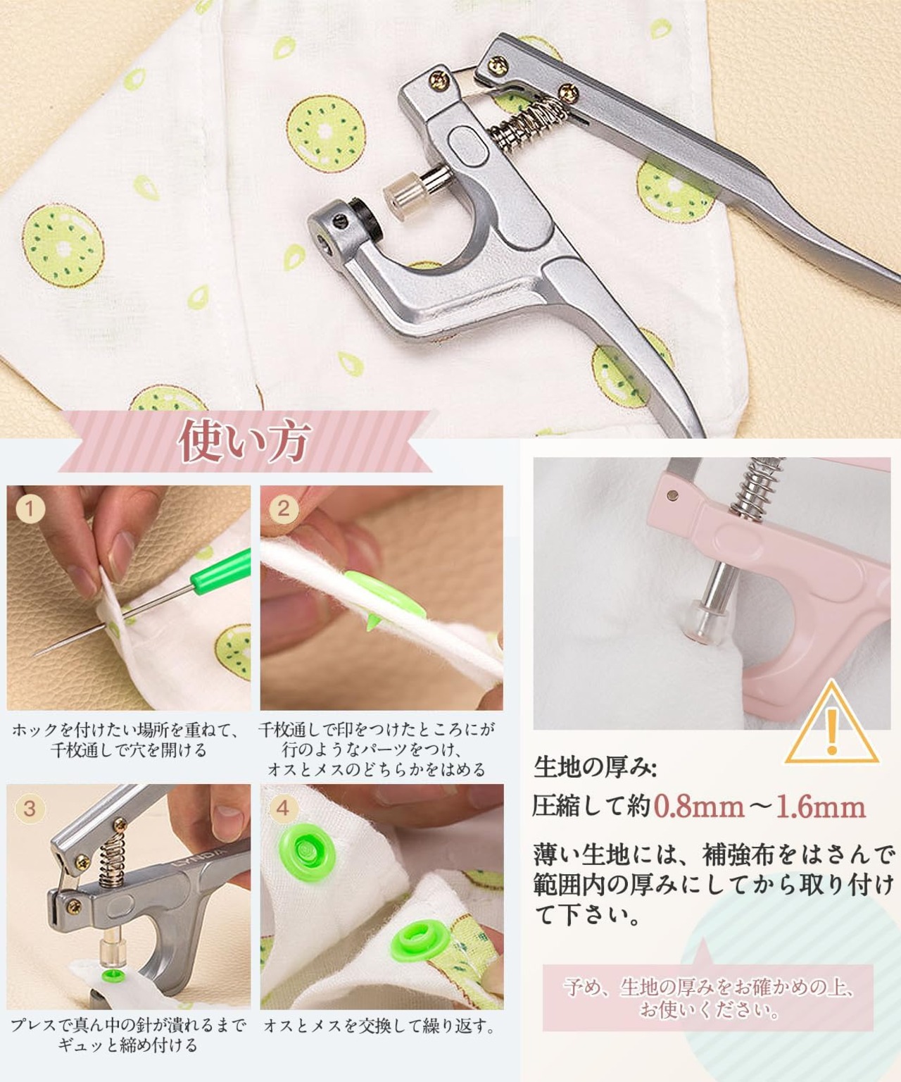 ご注意:ハンドプレスプライヤーは、金属製のスナップボタンには使用できません。樹脂製のスナップボタンにのみ使用できます。