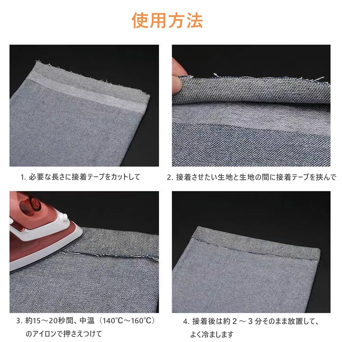 使用方法:必要な長さに接着テープをカットし、接着させたい生地と生地の間に接着テープを挟みます(接着テープを生地からはみ出ないように挟んでください)。生地の上からあて布をして、約15〜20秒間、中温(140℃?160℃)のアイロンで押さえつけます。接着後は約2〜3分そのまま放置して、よく冷まします。(強度が必要な場合はダブル使用や何重にも重ねて使用することができます)