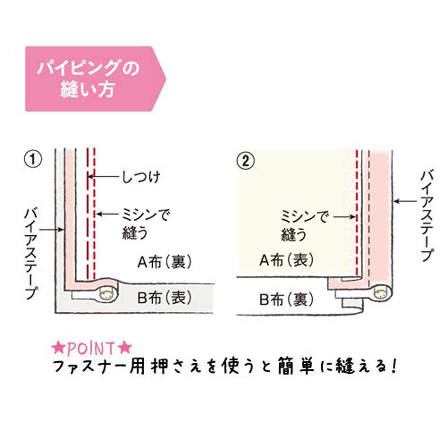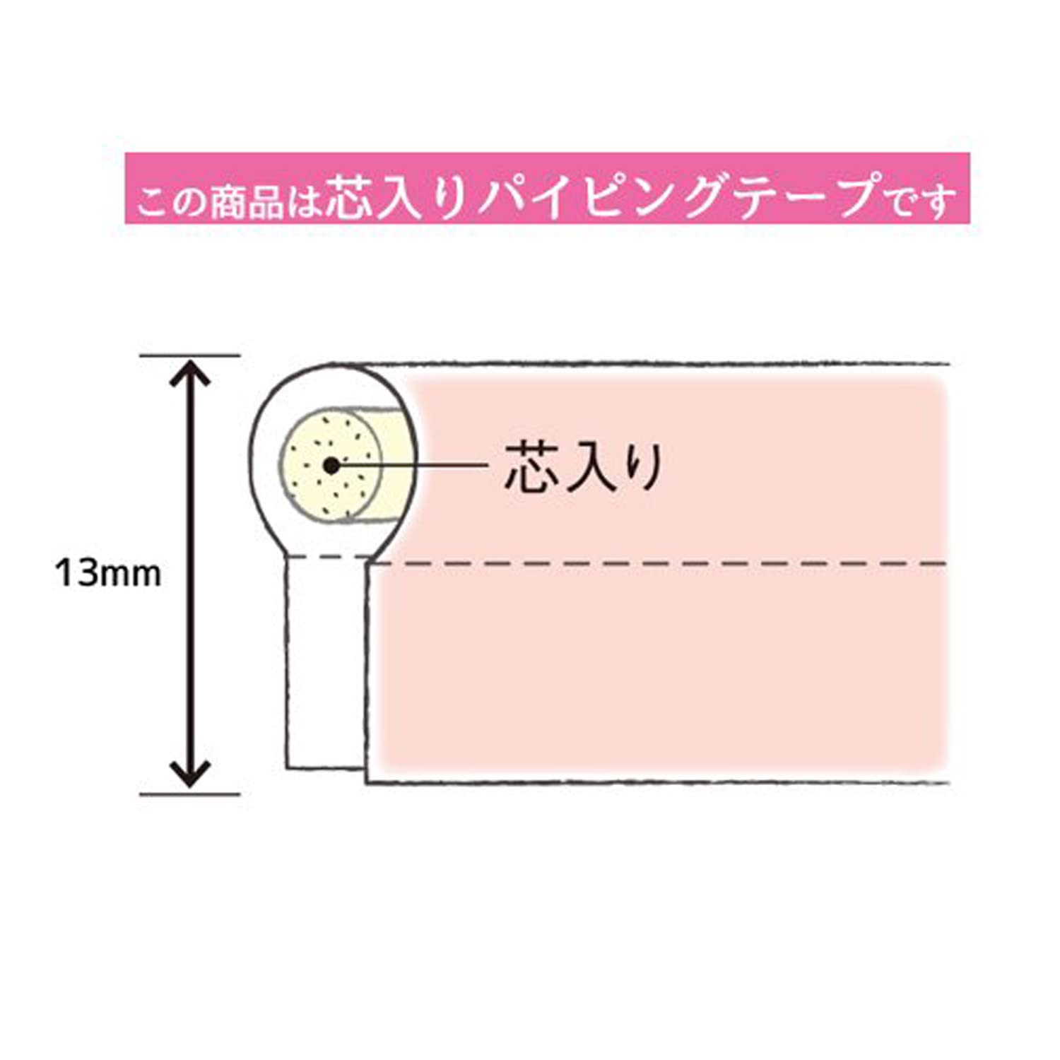 太い 芯 入り の バイアステープ です。衣服 の 裾上げ ・ ふちどり や 小物 などには欠かせない、 スタンダード な バイアステープ 。 クッション や パジャマ などの 玉出し や 飾り に。太い芯入りのバイアステープです。 切り替え 部分や、表布と 見返し の間にはさんで 飾り にしたり、 バッグ などの 縁 に使うと 補強 の役目も果たします。 ファスナー 用 押え金 を使うと簡単に縫えます。品番: CP7 パイピング よりも 太い 芯 が入っているので、 しっかり とした仕上がりになります。