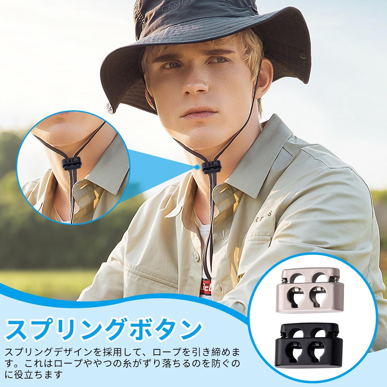 【使いやすいスプリングデザイン】スプリング式のボタンにより、紐の緩めや締め付けが驚くほど簡単に行えます。このデザインは特に、テントやバックパック、スポーツウェアなど、様々な装備品において便利です。手元での操作だけでなく、実際の使用環境でも極めて使い勝手が良いため、アウトドアや日常生活での活躍が期待できます。