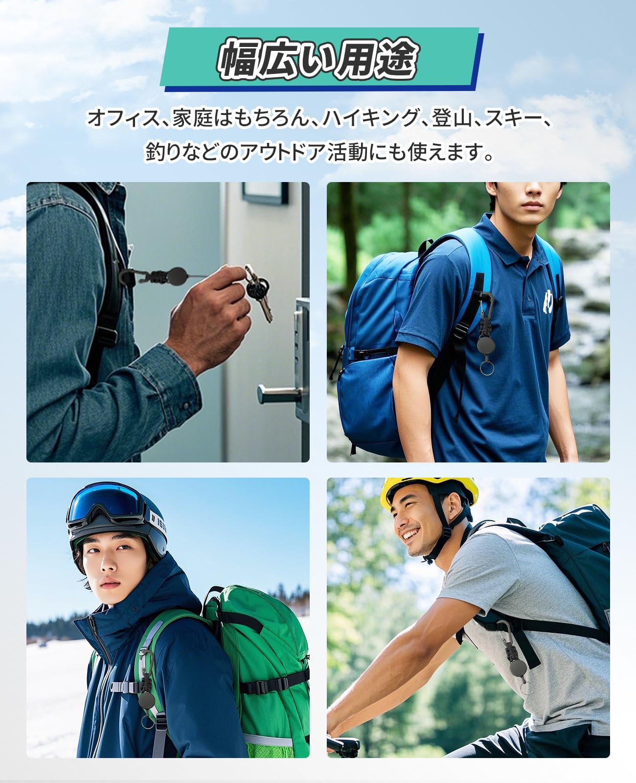 【商品仕様】リールストラップは2個セットになっております。長さは約15cm(平置き)。重さは約30グラム(2本)。直径1mmのスチールワイヤーロープを内蔵しており、最大約65cmまで巻き取り可能。バックパックやその他のアイテムに簡単に取り付けて、簡単に吊るすことができます。