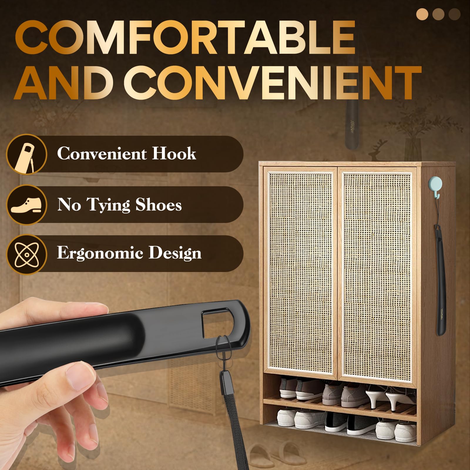 【全年齢向け】全長約41cmのロングタイプ靴べら。高齢者や術後の方、妊婦さん、腰や膝に不安のある方など、靴を履く動作が困難なすべての方に最適な設計です。この靴ベラを使用すれば、毎日の靴履きのストレスから解放され、より快適で自立した生活をサポートします。