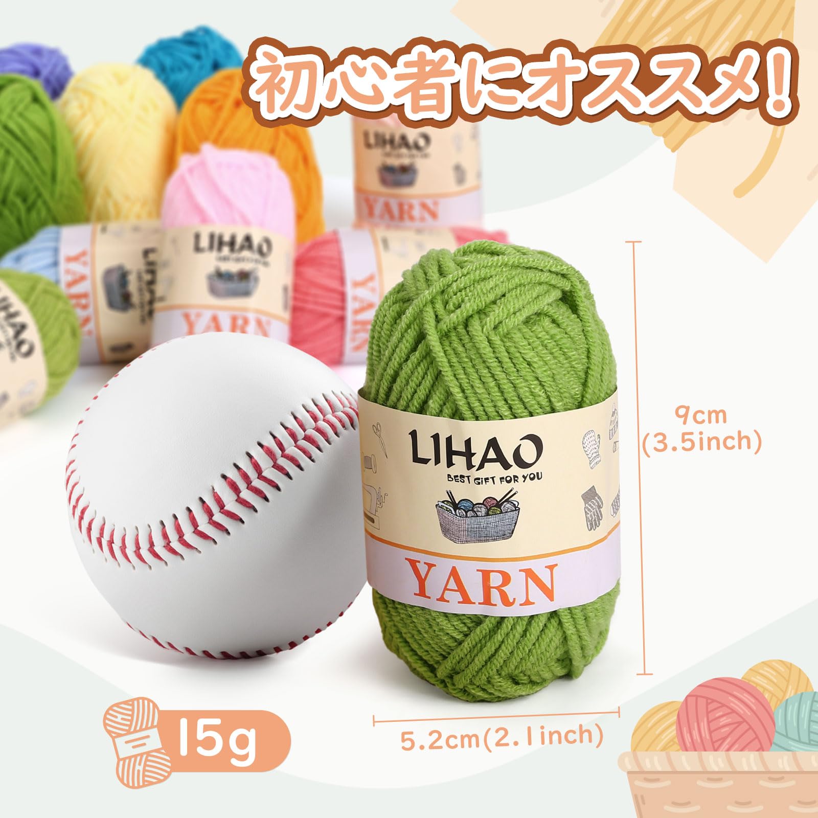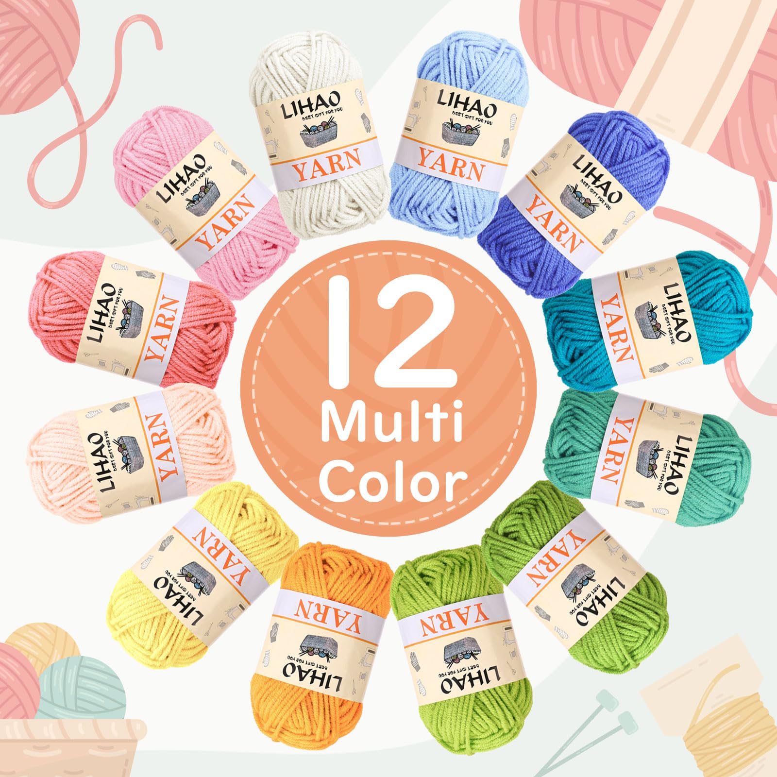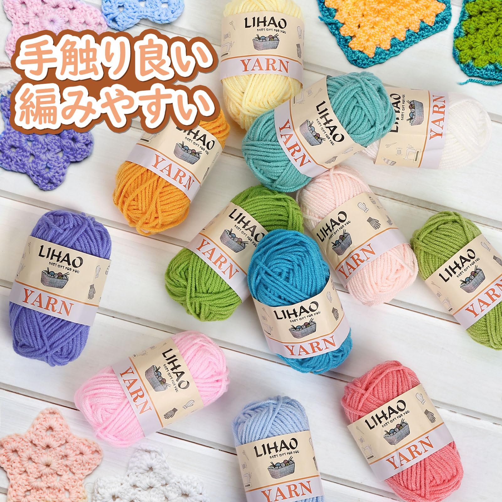 LIHAO 毛糸 中細 12色セット 4本撚り アクリル 糸 1玉15g 約26m 編み物 編み糸 織り糸 ぬいぐるみ用糸