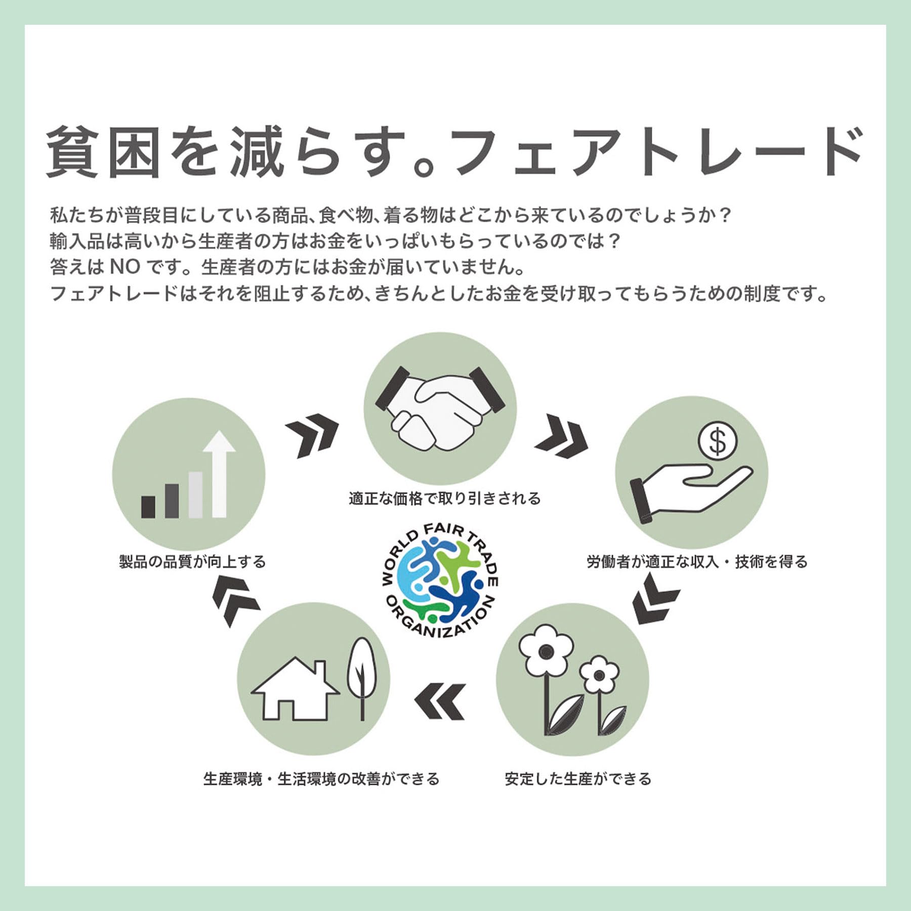 【フェアトレード認定商品】フェアトレードとは、直訳すると「公平・校正な貿易」。開発途上国の原料や製品を適正な価格で継続的に購入することにより、立場の弱い開発途上国の生産者や労働者の生活改善と自立を目指す「貿易のしくみ」をいいます。