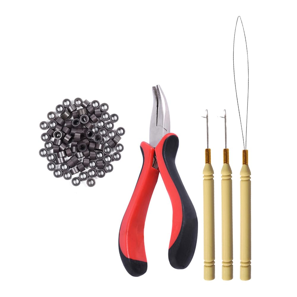 ヘアエクステンションセット 100個マイクロリングリンク プライヤー ループニードル ウイッグ用ツールセット(ダークブラウン)