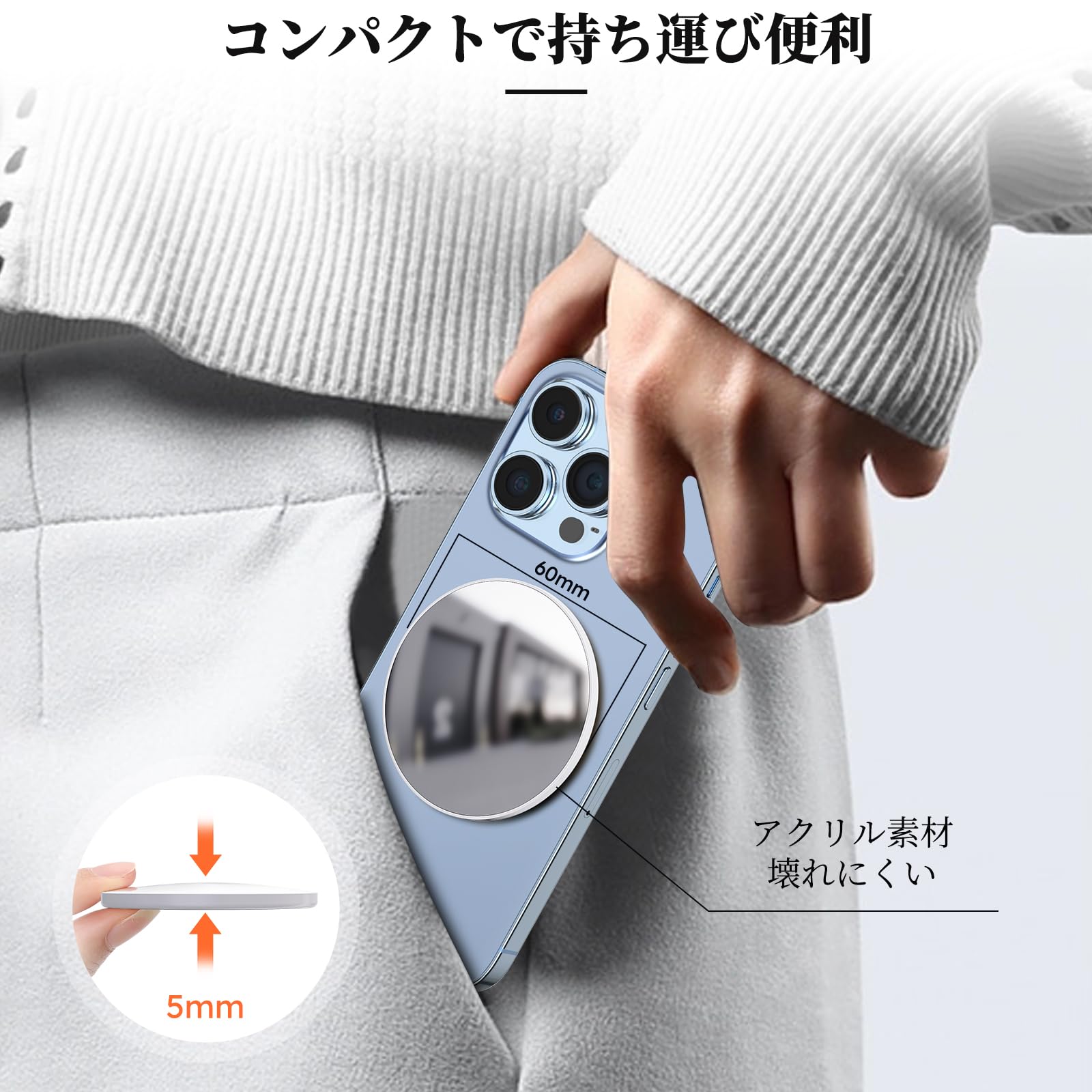 ?「コンパクト、携帯性に優れる」マグネット式自撮り用鏡はコンパクトで軽量なデザインなので、携帯するのに便利です。携帯中にカバンやポケットに簡単に収まり、いつでもどこでもセルフィーを楽しむことができます。
