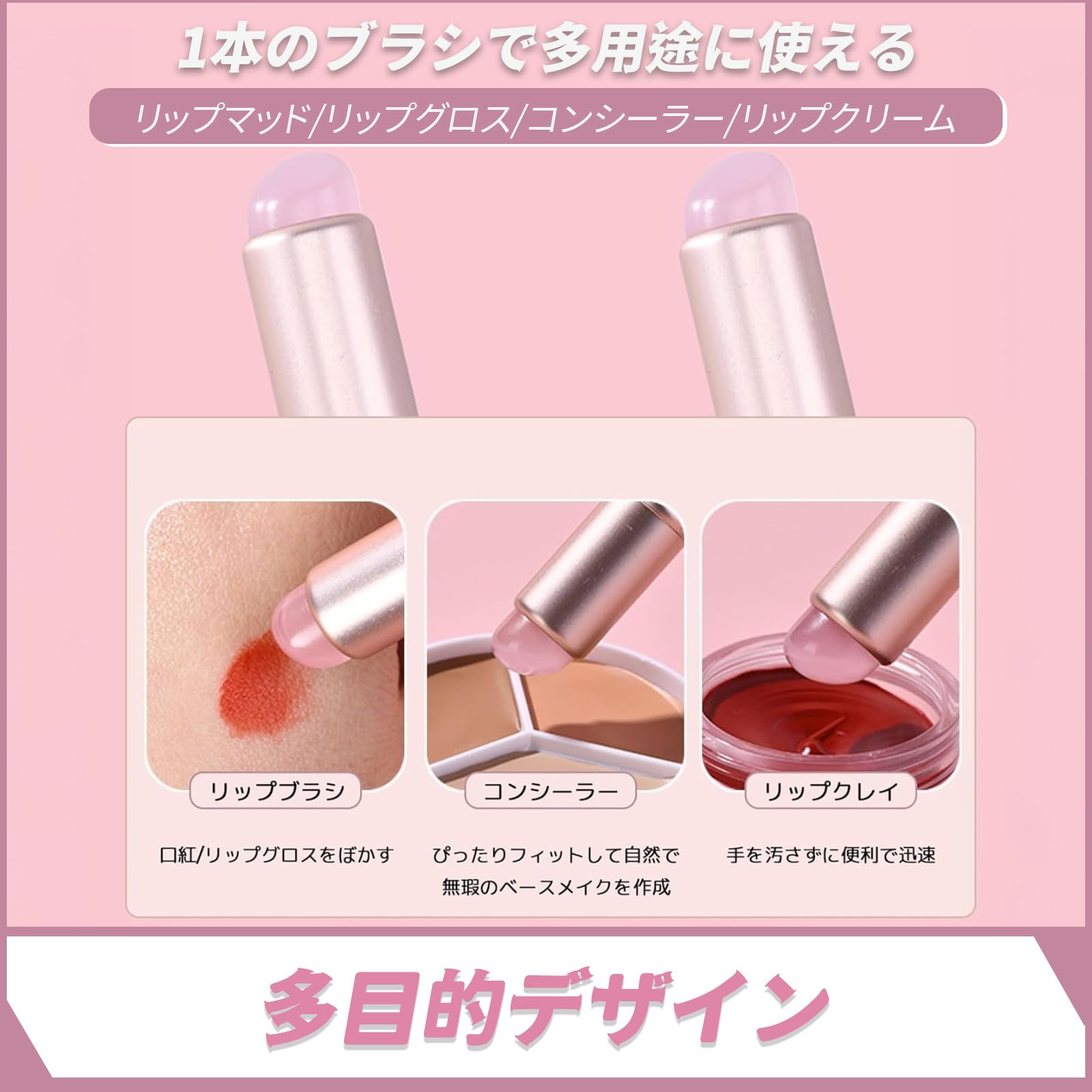 【多目的デザイン】:口紅、コンシーラー、ファンデーション、その他の化粧品を塗布するのに適しており、正確なメイクアップとより自然な効果を実現します。各種クリーム・パウダー化粧品との相性も良く、多様なニーズにお応えします。