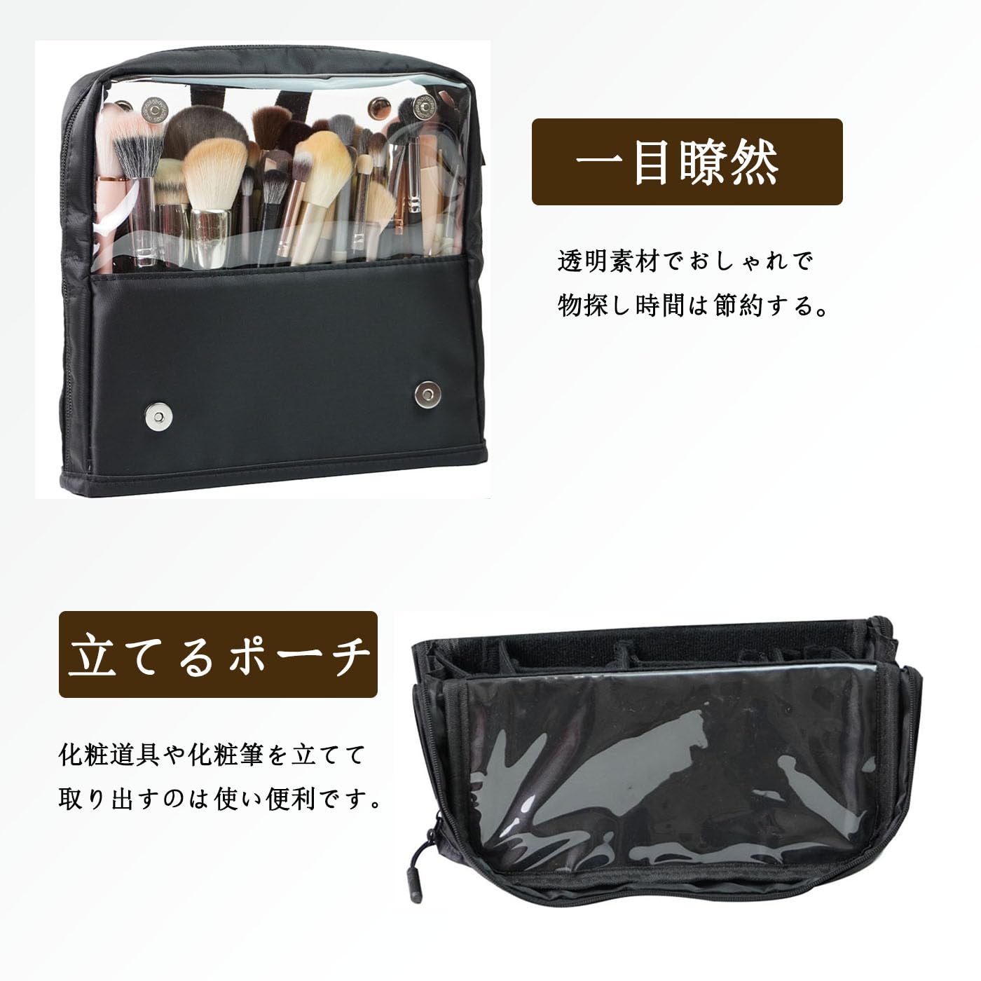 ▲ 自立式デザインで使いやすさ抜群: ポーチを開けると自立する設計で、メイクブラシやコスメが一目で確認できます。忙しい朝や外出先でも、スムーズにアイテムを取り出せます。