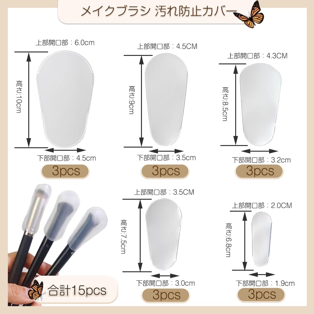 セット内容:メイクブラシ 汚れ防止カバー15枚セット(5サイズ各3枚);素材: EVA;ブラシカバーはメイクブラシの毛を包み込み、ホコリや汚れなどの外部物質による毛の汚れを防ぎ、ブラシを清潔で衛生的に保つことができます。