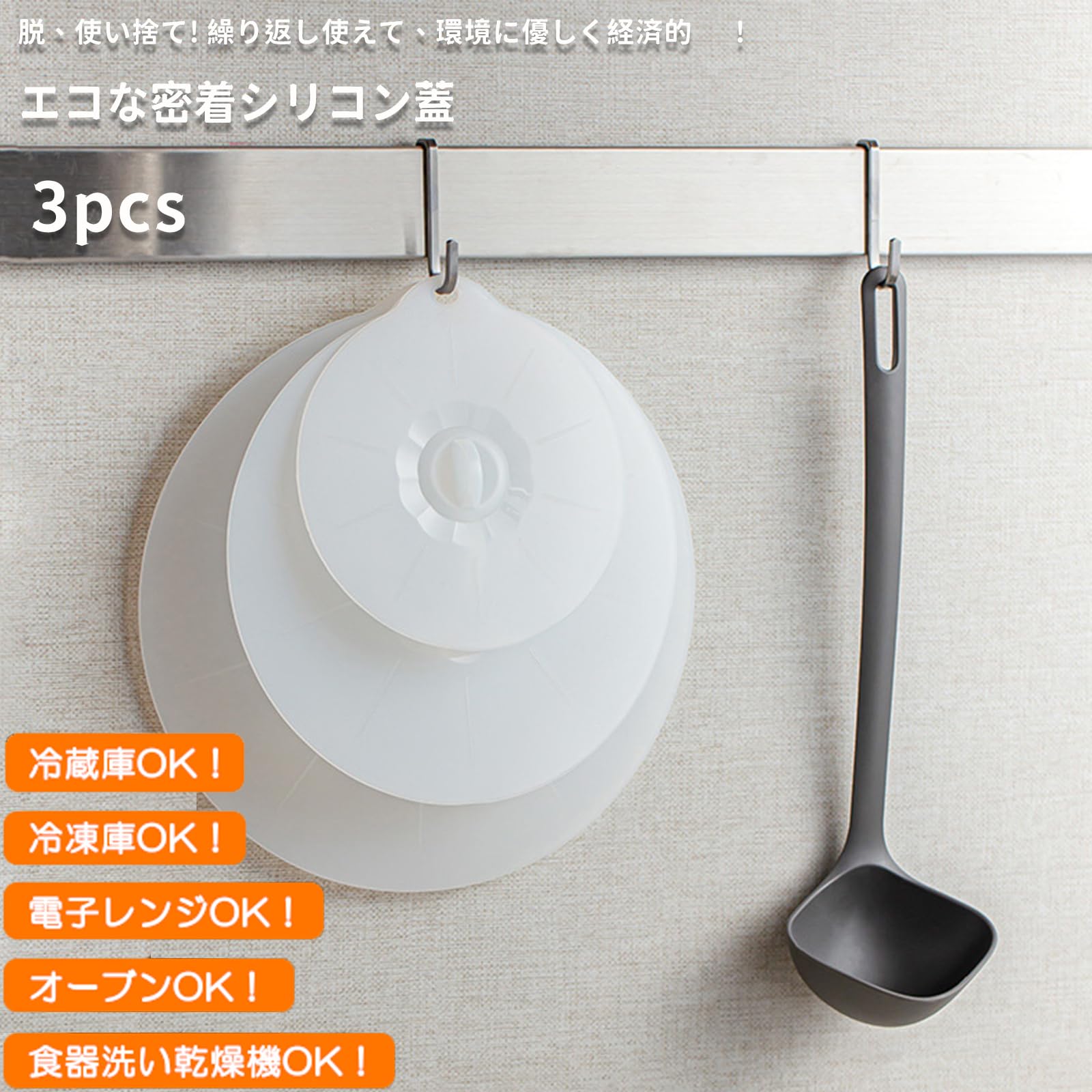 シリコン蓋 シリコンカバー【3点セット】 耐熱耐冷 シリコンふた 鍋蓋シリコンマグカップ蓋 シリコンカバー 密閉蓋 調理の貯蔵 吸着力 電子レンジ 食洗機対応 (半透明ホワイト)