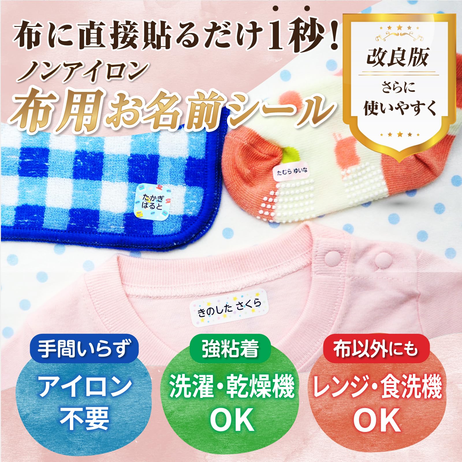 【強粘着】忙しいママの声を元に研究開発された、アイロンなしで布に貼るだけのお名前シール♪忙しい朝でもペタッと貼るだけでお名前付けが完了します♪