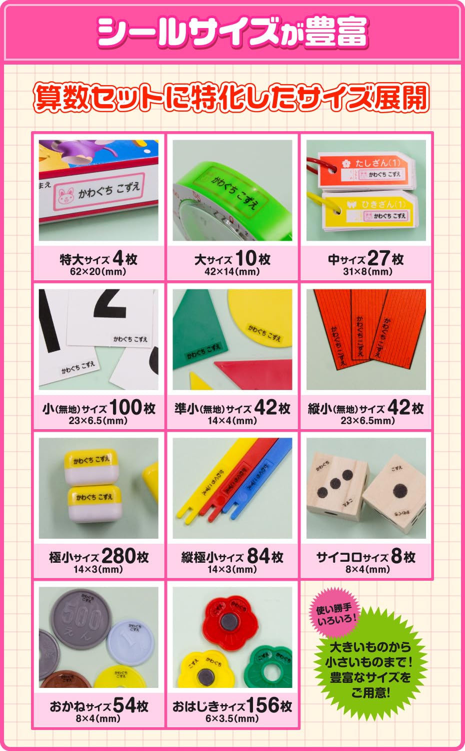 【算数セット用シール透明タイプ】通常の算数セット用のシールより下地に馴染んで、デザインの邪魔をしないシンプルな透明シールです。強粘着タイプのシールを採用しているため、はがれにくいです。11種類とサイズが豊富なため、算数セットの内容品のサイズにぴったりと合わせられます!