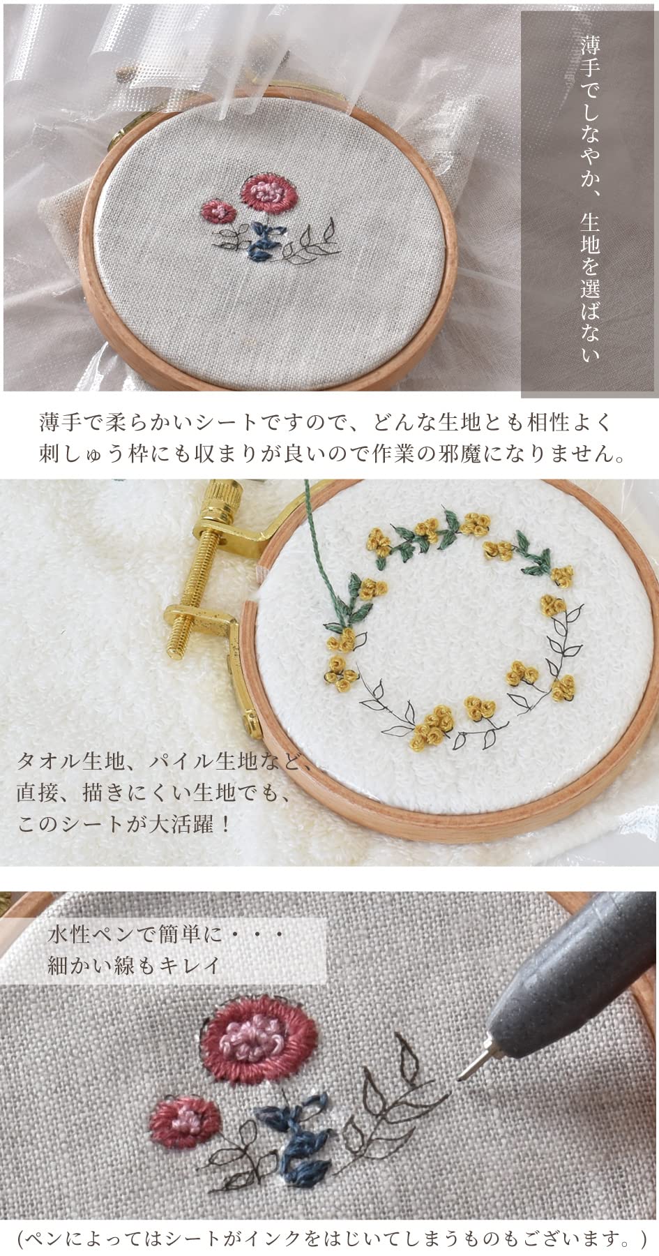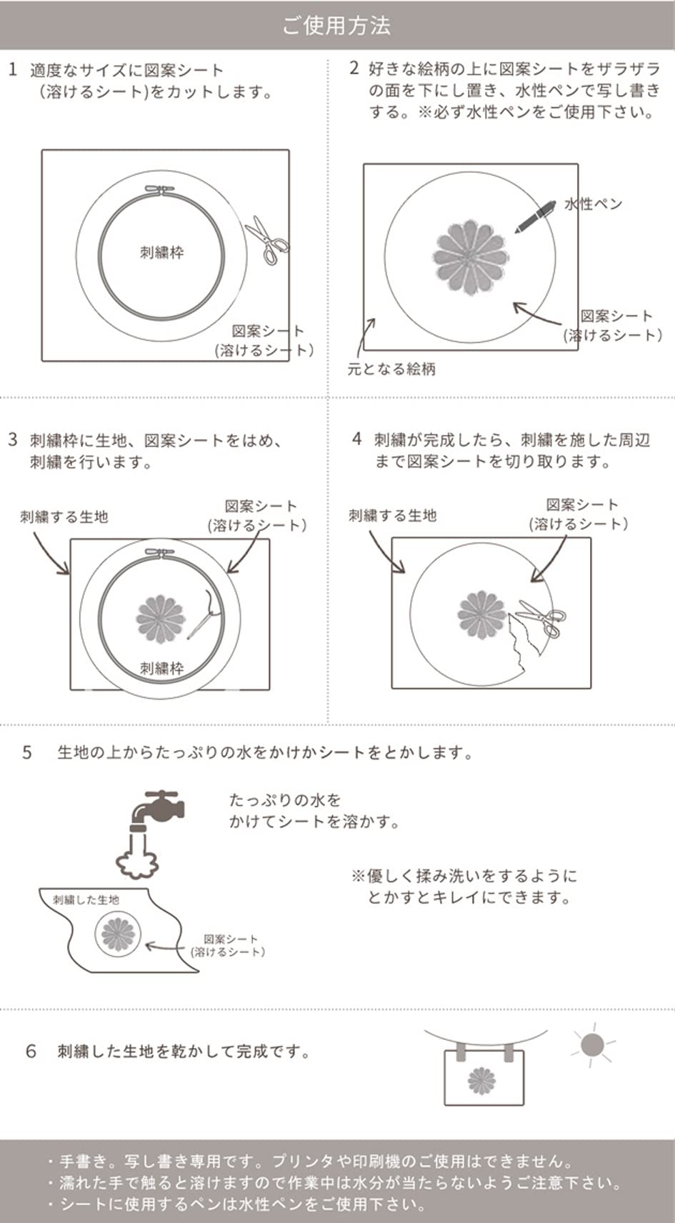 お取扱いについて:水性のシートです。少しの水滴や水分があると溶けてしまいますので、作業中や保管には水分に触れないように気をつけて下さい。刺繍などでご使用になる際は、水性ペンをご利用下さい。ペンによってはインクをはじいてしまう場合もございます。試し書きを行ってからご利用下さい。手書き・転写用です。プリンタの印刷ではご利用できません。