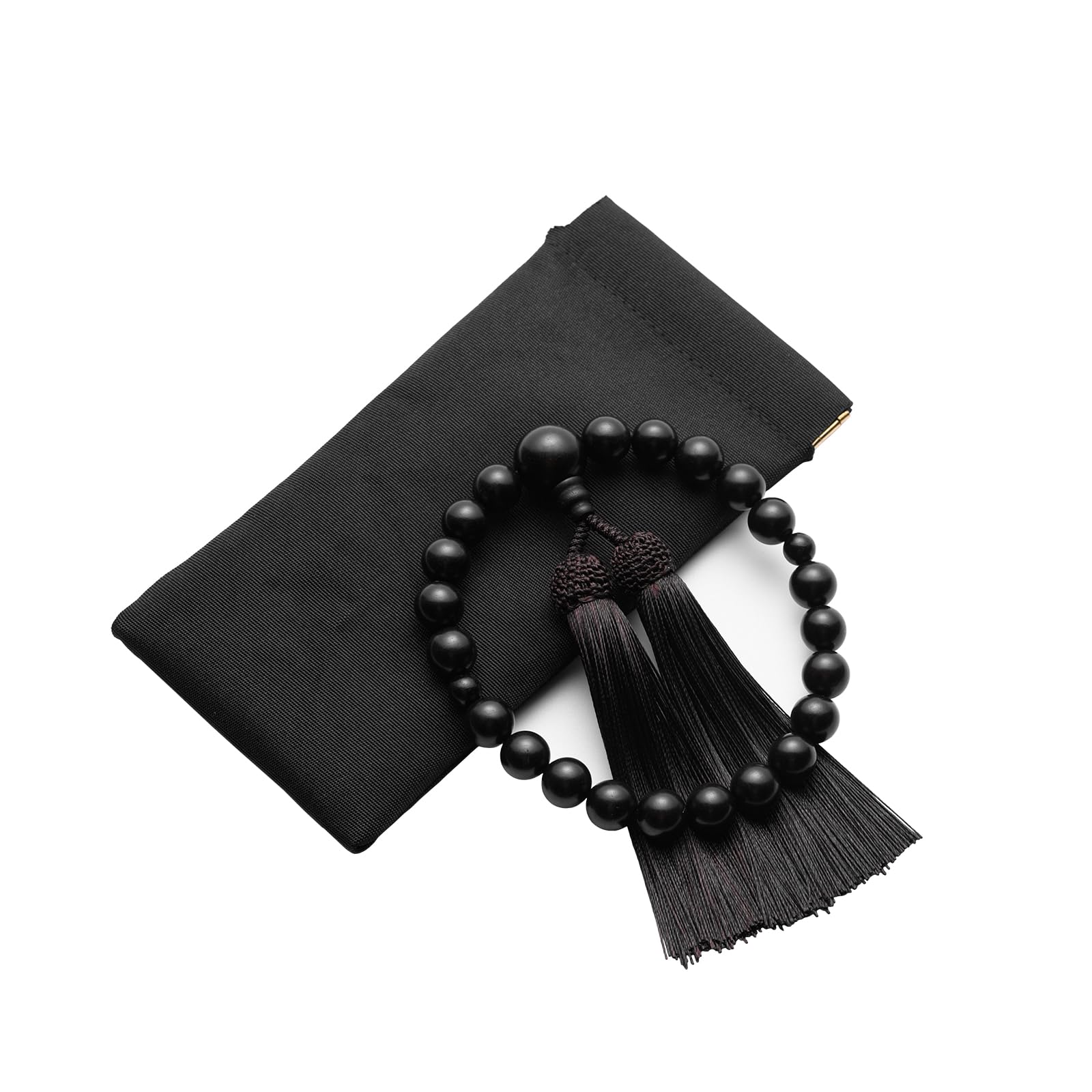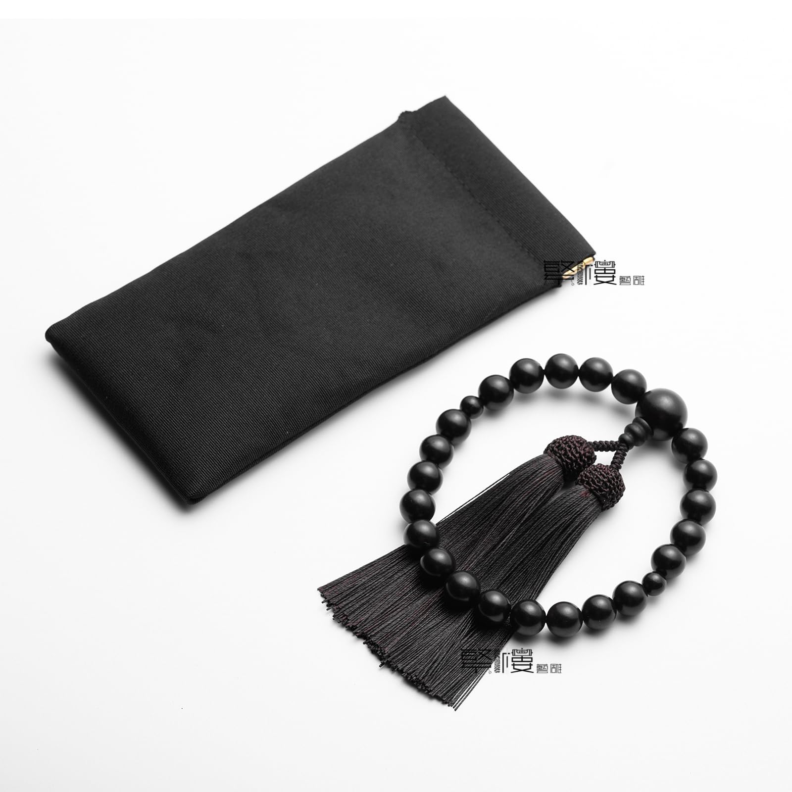 ?念珠の材料:念珠は全部本場の黒木から作られ、中には18ミリメートルの親珠を1個、12ミリメートルの主珠を22個、また8ミリメートルの天珠を2個含み、共に25個となり、お客様の都合のため、念珠袋(15cm*9.5cm)も付けます。