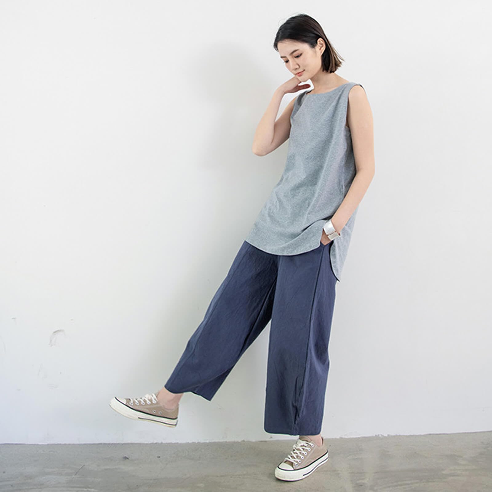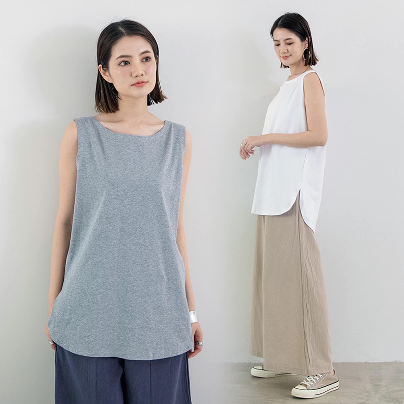 Mサイズ(45-55kg)。ラウンド カット ホワイト ロング タンクトップ 。 こちらはチュニック丈タンクトップになります。 レイヤードスタイルでもサマになるよう少し長めの丈に計算されています。 お手持ちのトップスと重ね着するだけで雰囲気がぐっと変わります。 柔らかくてなめらかな素材なので着心地も◎