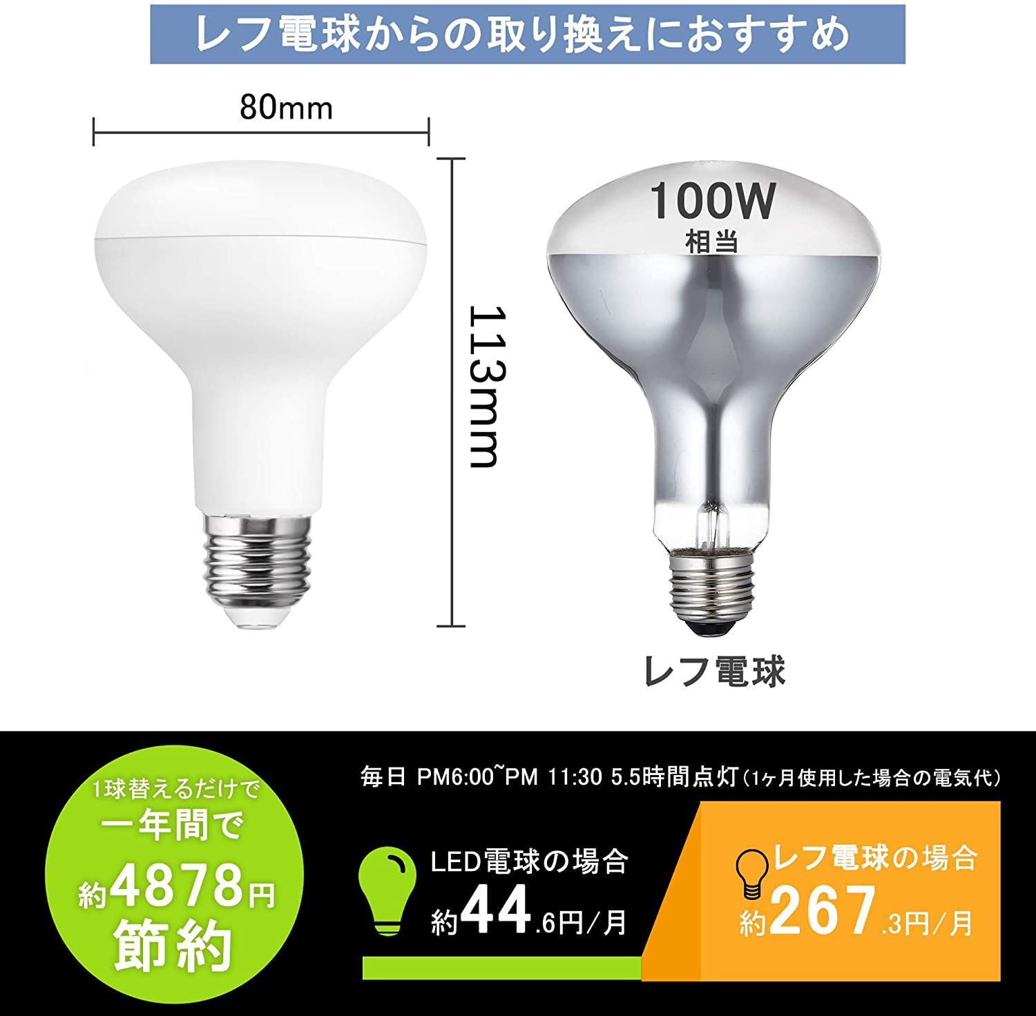 【省エネ&長寿命】従来の100W形レフランプより明るくて、消費電力は100W形レフランプの10%しかありません。LED電球1球で白熱電球30球相当(寿命は一般白熱電球の約30倍)。1日10時間以上のご利用でも約8年間交換不要。電球交換の手間とお金も省くことができます。取り付けが面倒な高所への設置におすすめです。