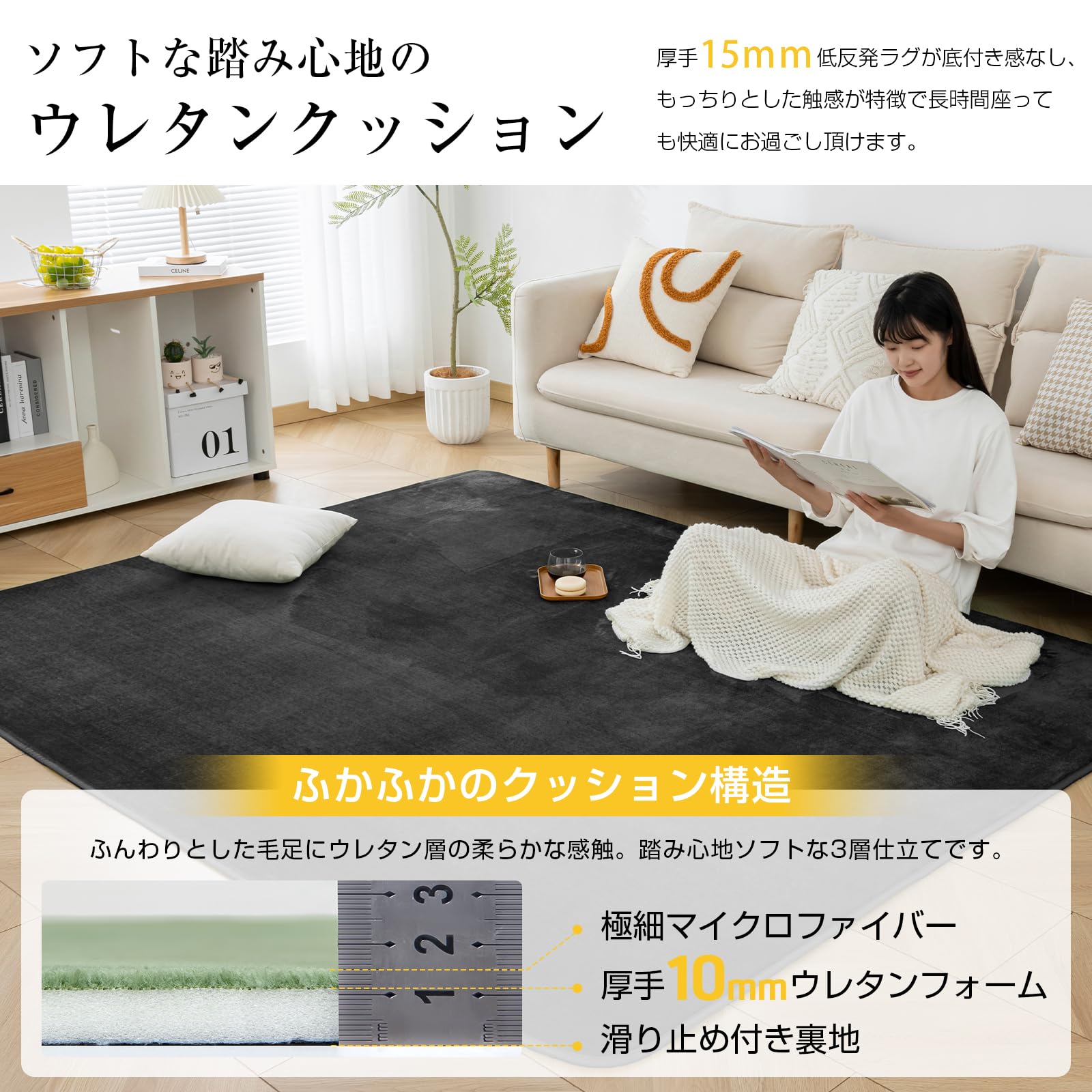 【低反発カーペット】厚さ約15mmの低反発ラグマットは、ふんわりとした踏み心地で、底付き感を感じることなくゆったりとリラックスできます。体圧をバランスよく分散するため、長時間座っていても疲れにくい設計です。ウレタンクッションによる防音効果も抜群で、物の落下音や足音など、床から階下へ伝わる騒音を軽減し、防音ラグとして、快適な暮らしをサポートします。