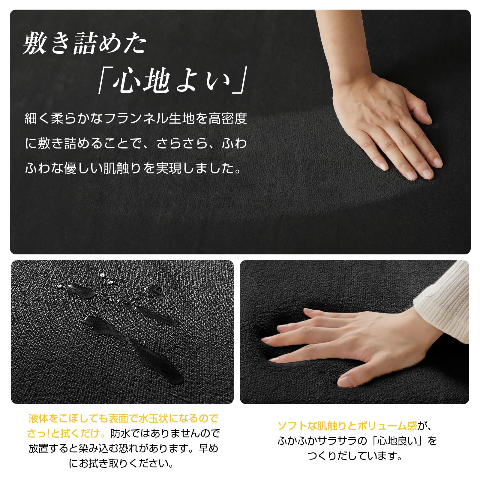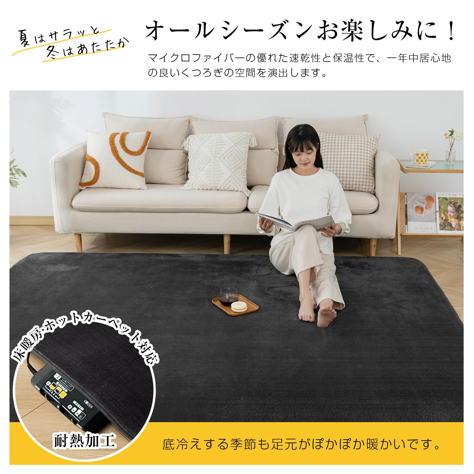 【オールシーズン対応】絨毯表面は、細く柔らかなフランネル生地を高密度に敷き詰めることで、さらさらとしたふわふわの肌触りを実現します。極細マイクロファイバーを使用しているため、軽量で保温性・速乾性に優れており、夏はサラッと、冬はあたたかくお使いいただけます。床暖房やホットカーペットにも対応し、底冷えする季節でも足元をぽかぽかと温かく保ちます。