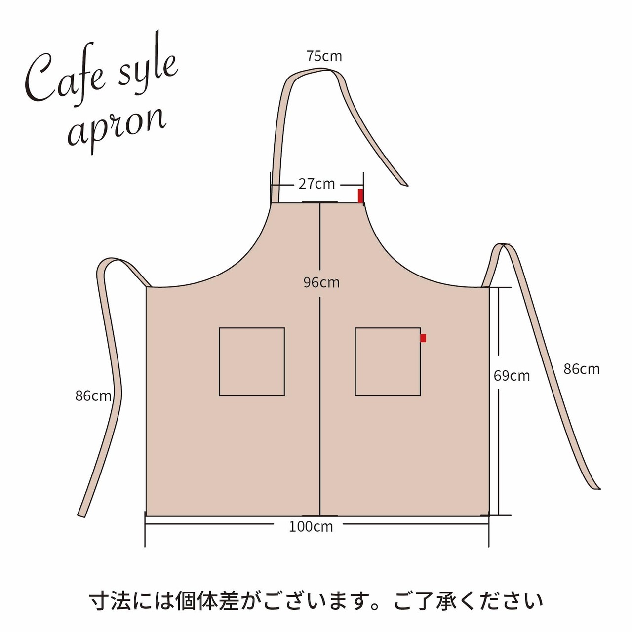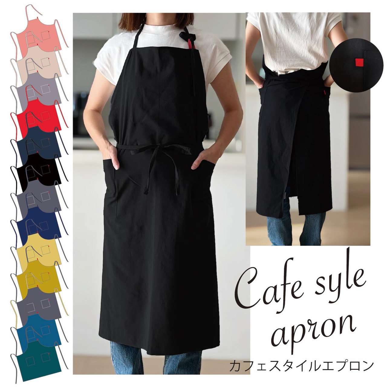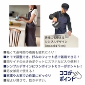 このエプロンは、カフェ風のおしゃれなデザインが特徴で、幅広い年齢層に対応する豊富なカラーバリエーションがあります。