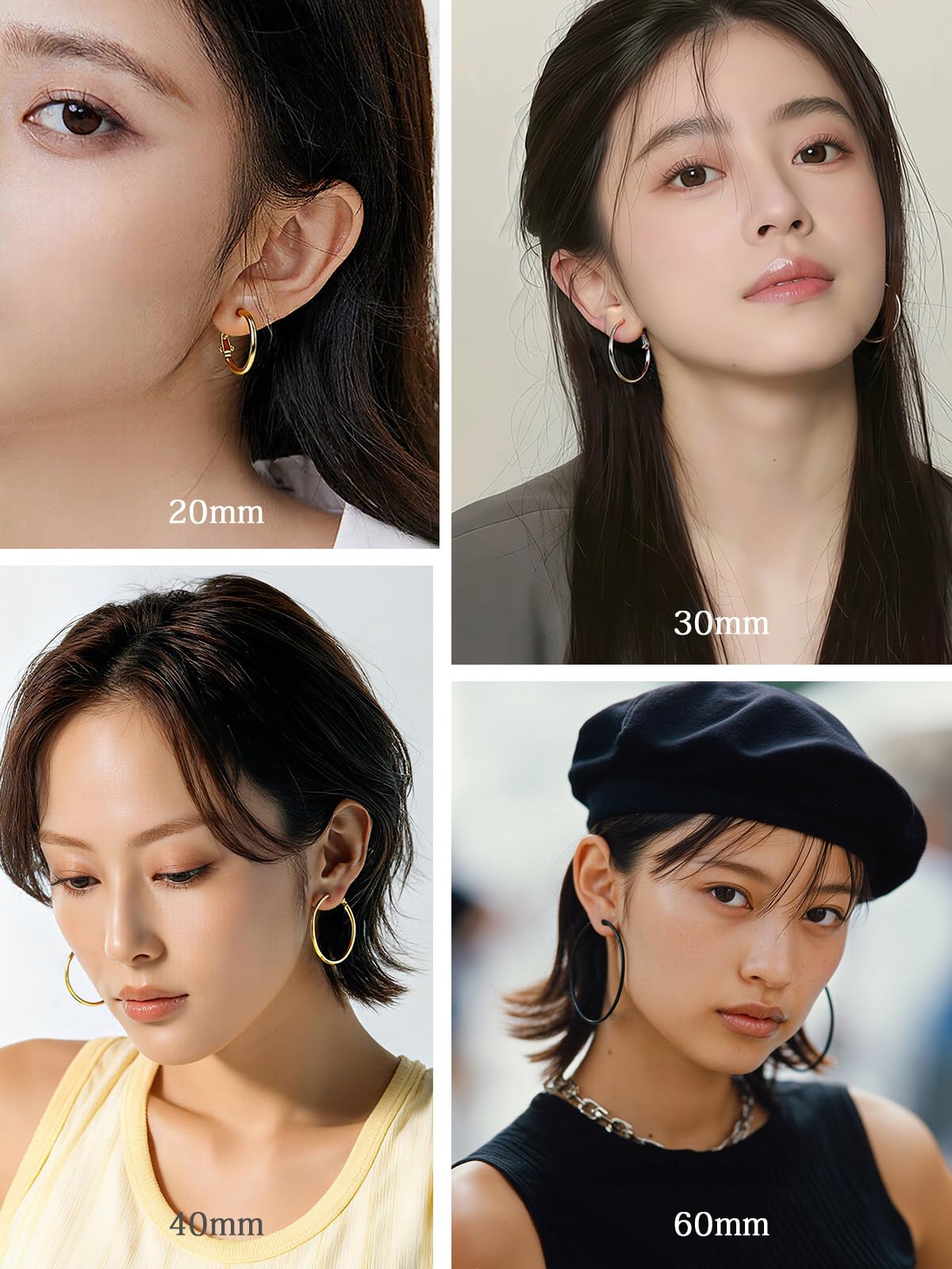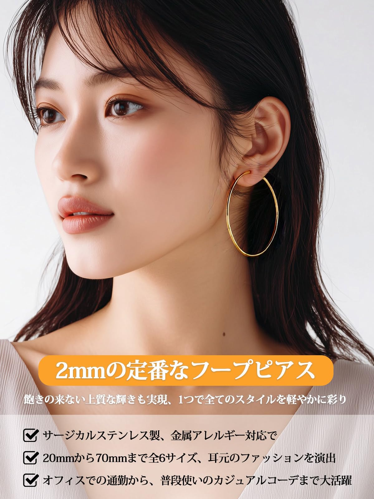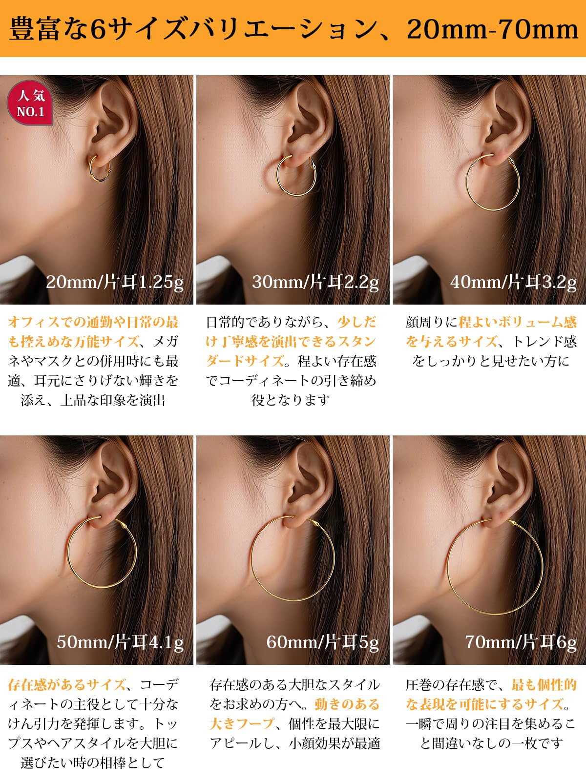 【定番なフープピアス】流行を超え、もはや定番アイテムになりましたレディースピアスが登場!繊細でありながら洗練されたデザイン、顔周りを明るく引き立て、20mm・30 mm・40 mm・50mm・60 mm・70mm人気の6サイズになり、コーディネートのアイテムになります。