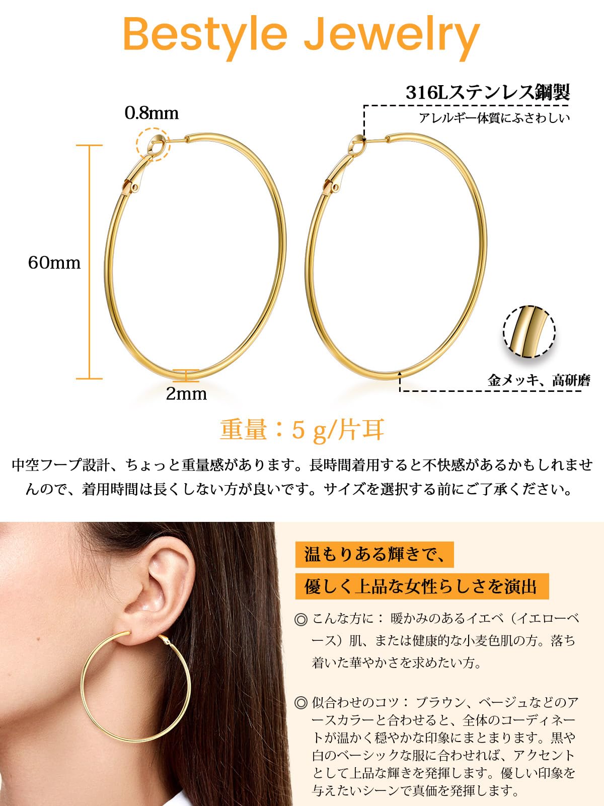 Bestyle フープピアス レディース リンク ピアス 大きめ サージカルステンレス アレルギー対応 幅2mm 定番 両耳 20-70mm プレゼント アクセサリー