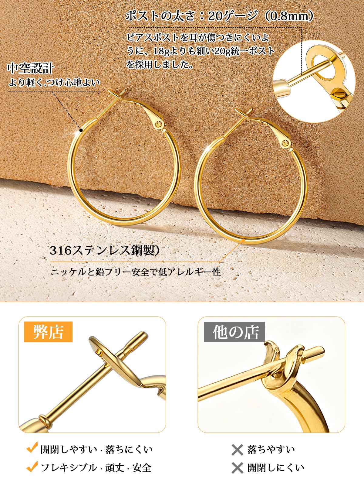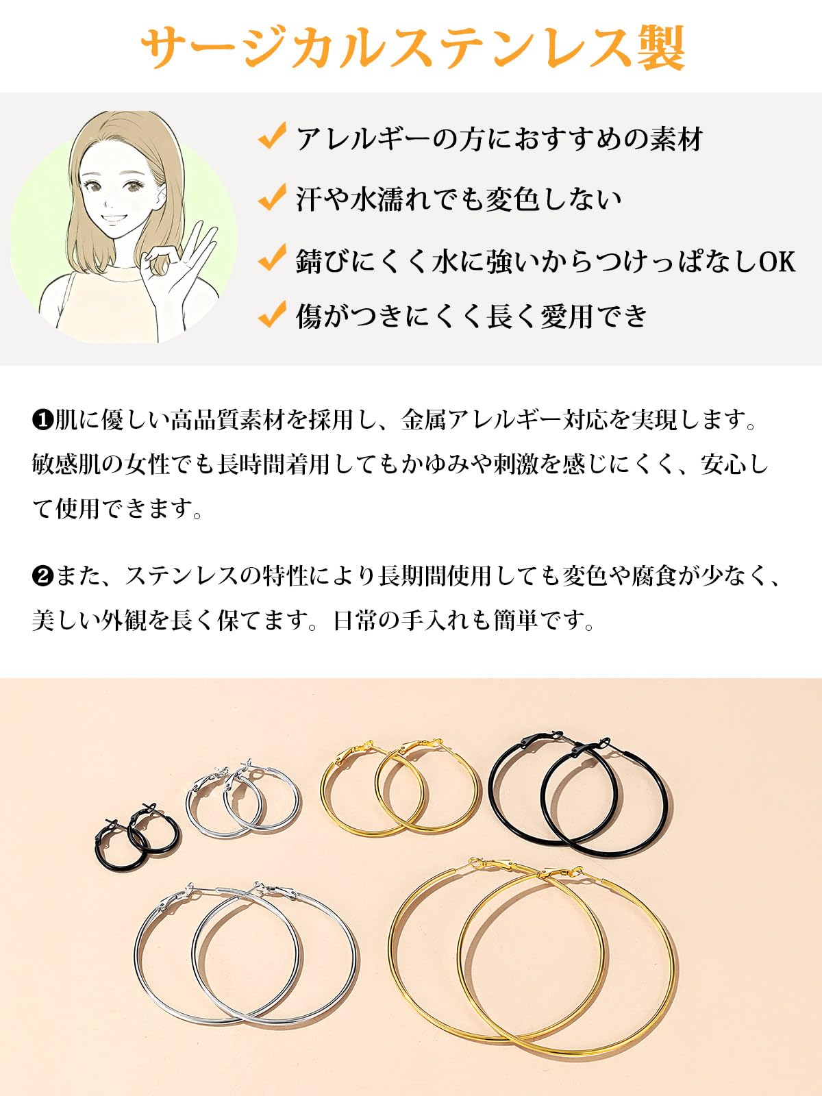 【高品質素材】フープピアス全体にサージカルステンレスを採用して、ステンレスは色落ちにくく、アレルギーになりにくく、頑丈で優れた金属です。耳元にも優しく、金属アレルギーが気になる方でも、長時間のご使用でも安心です。汗や水に強い特性で美しさをピアスが長くキープします。