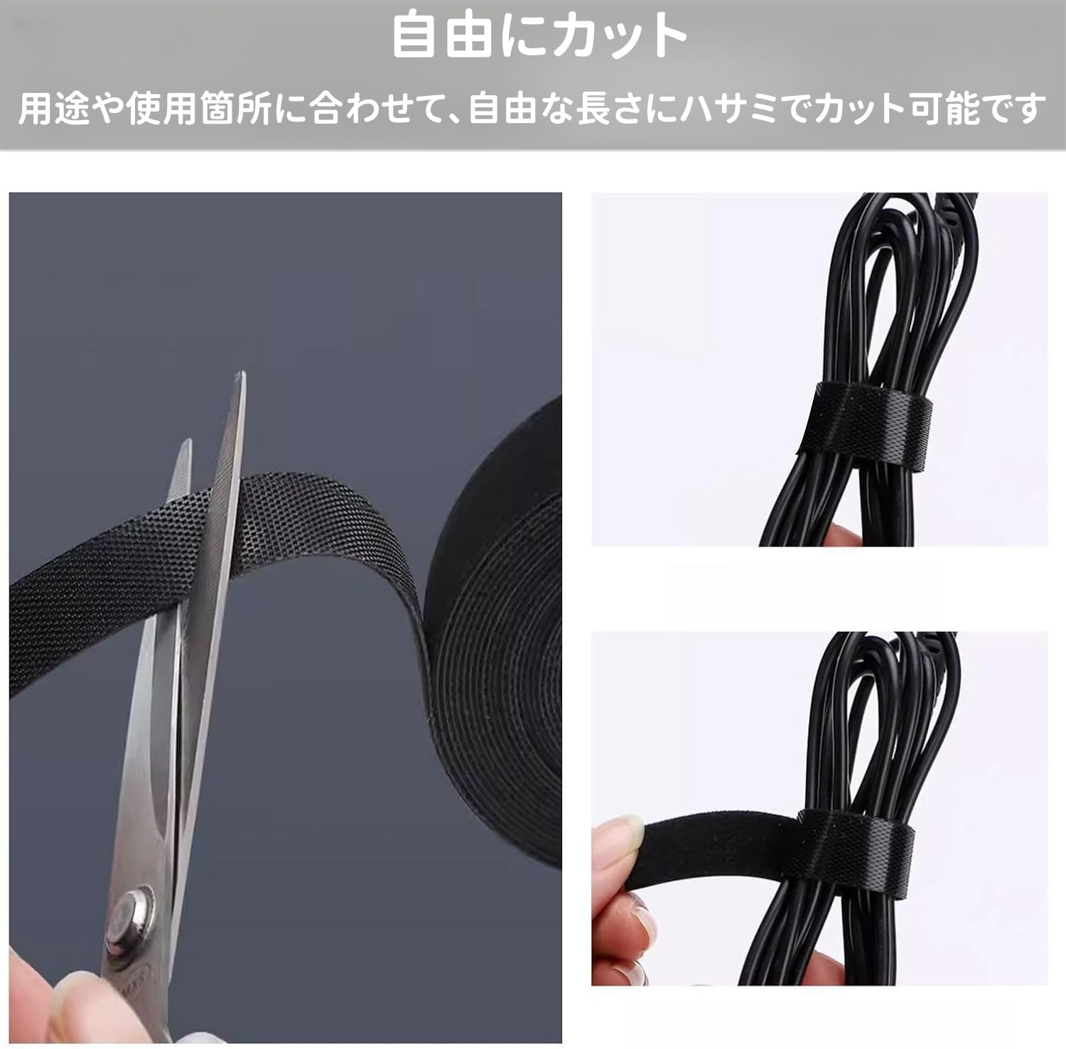 面ファスナー 結束バンド まとめる 耐熱テープ強力 自由にカット強力 ケーブル配線整理 まとめ 収納用 固定 再利用可能 オフィス用 家庭用 部屋用 荷物梱包 屋外 ブラック10mmx5m