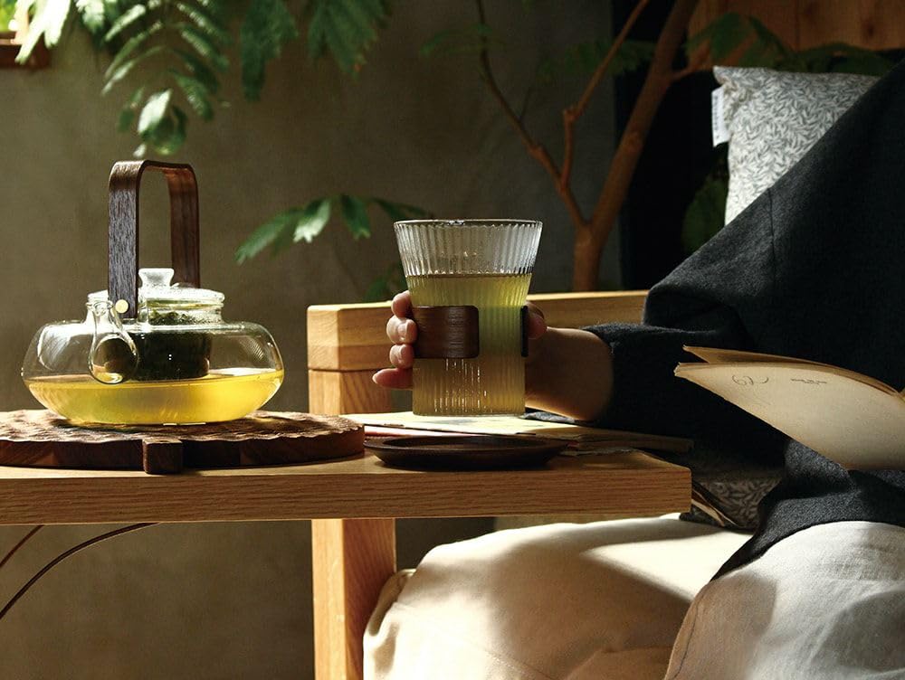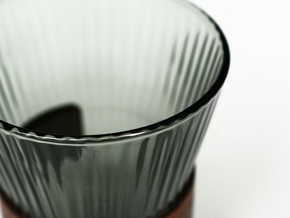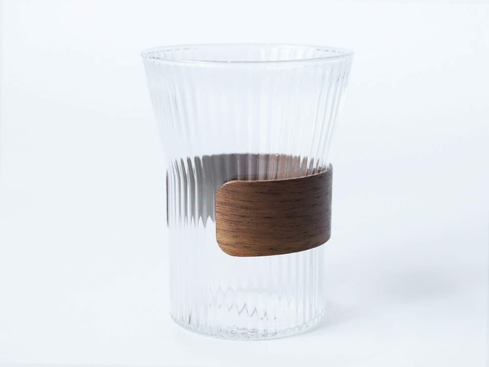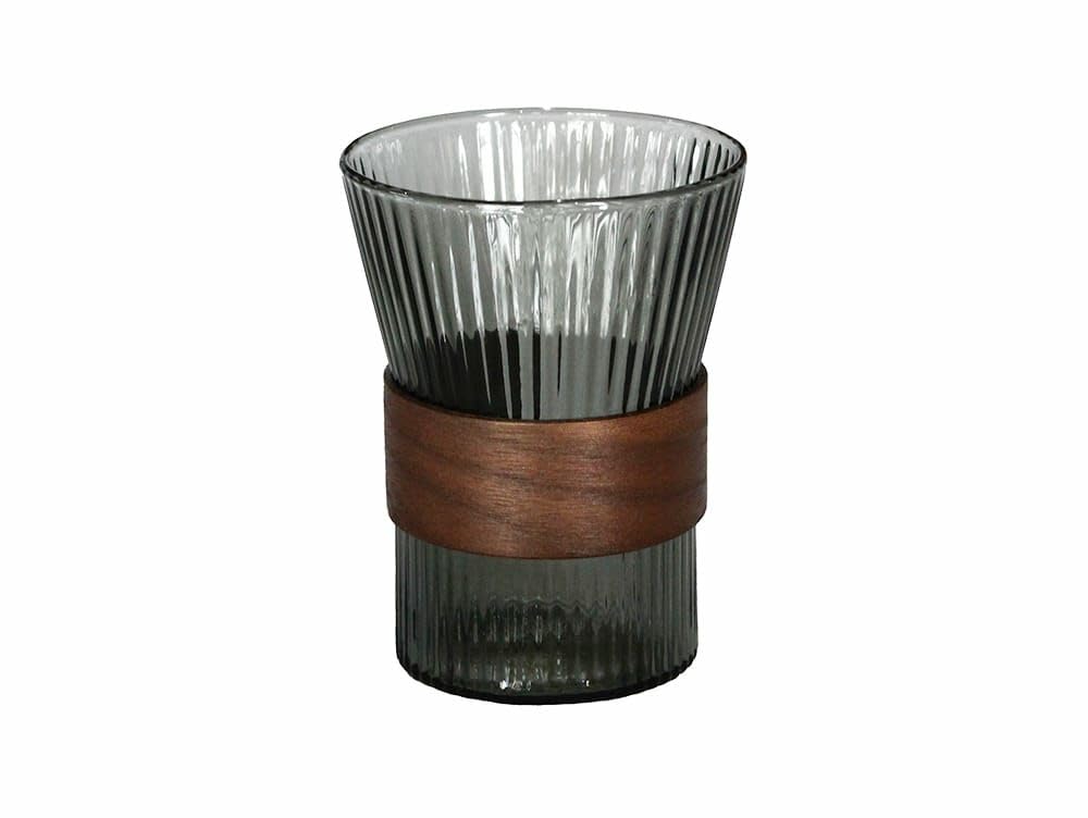 暖かみのある天然のウォルナット材をスリーブ部分に使用したカップ。 飲み口がワイドに広がっておりシンプルながらも存在感あるグラスです。 美しいウォルナットの木目と細かくリブが施されキラキラと光るガラスカップの調和をお楽しみ下さい。