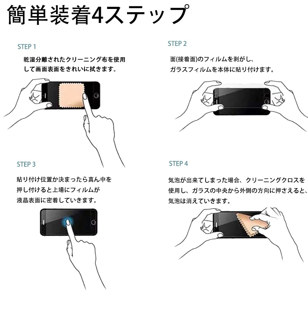 【簡単貼り付け】:初心者でも完璧にでき、失敗を心配する必要はありません。1、付属のツールを使って携帯電話の画面表面を拭きます。また、残ったホコリはダストシールで取り除いてください。2、フィルムの接着面の保護フィルムをはがす。コーナーの位置に合わせて、画面上に配置します。3、四角取付け、その時位置がずれてから修正する。4、位置決め確定後、中間からガラスフィルムを上下に貼り付ける。5、次に、ガラス膜を中央から上下左右に押し、気泡が入らないようにする。6、密着箇所や波状ムラがなければ、上から強く押す。