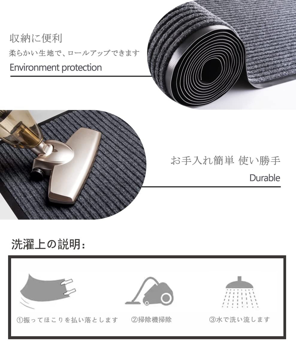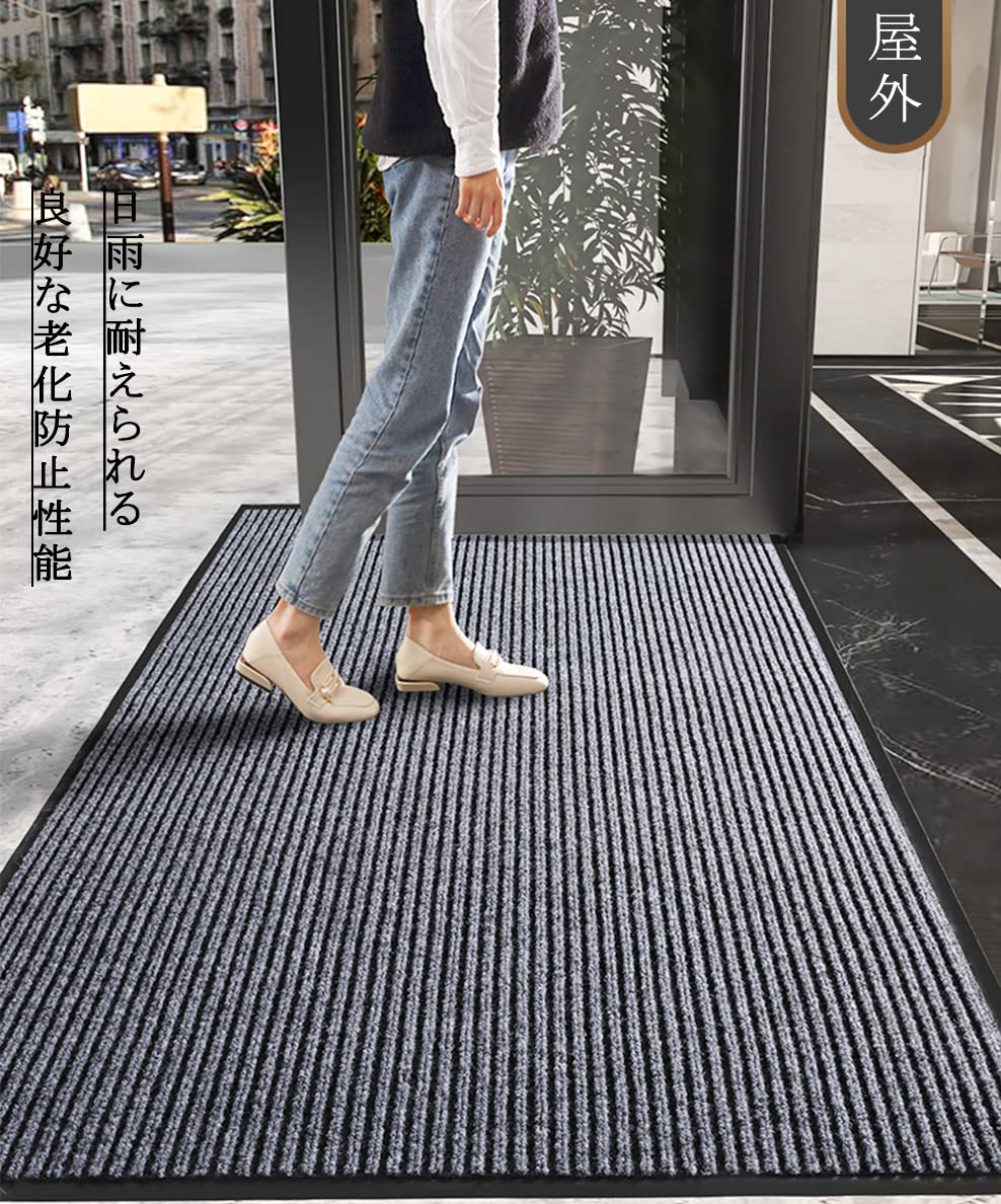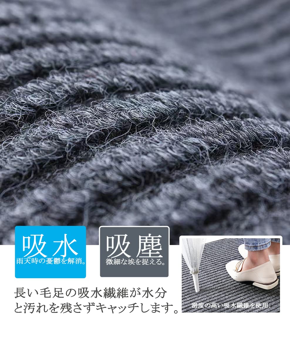 【泥落とし、吸水】屋内、屋外でお使いいただける玄関マットです。表面の凸凹が屋内に持ち込みたくないホコリ汚れや水などをしっかり捕らえ、吸収する機能的なマットです。長い梅雨の日でも大雪の日の中でもフロア汚れを最小限に抑えます!また、マットが抗菌性・防臭性、一年中も快適にご使用いただけます