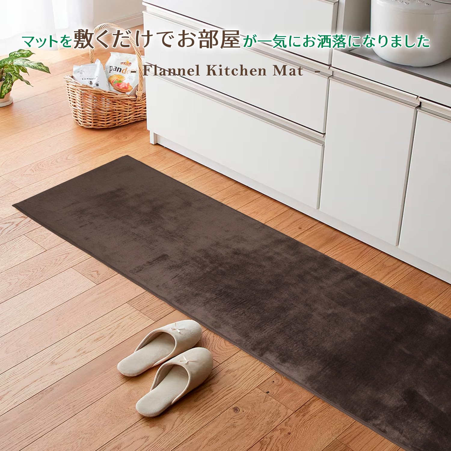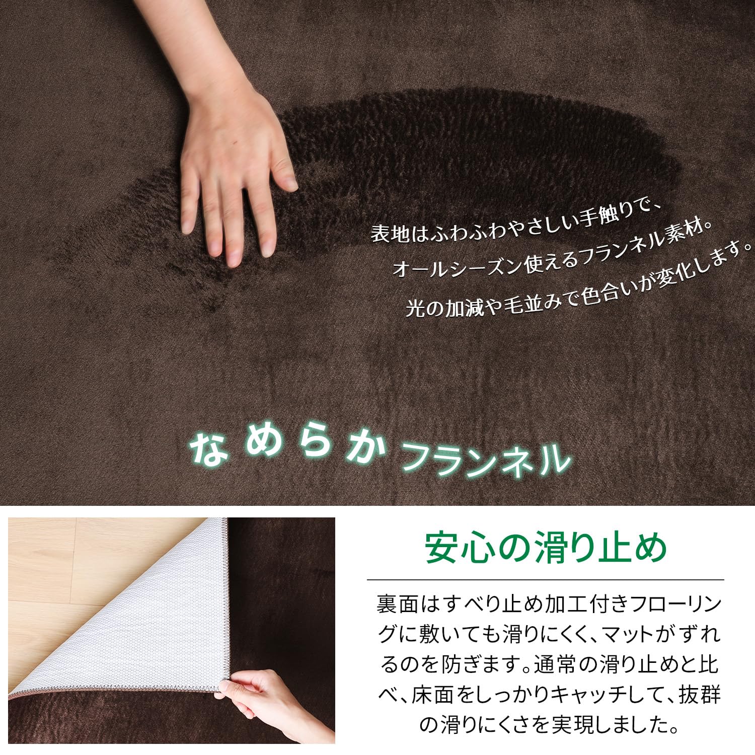 「さらふわ・フランネルキッチンマット」さわり心地が抜群に気持ちいいフランネル生地を使用、しっとり&ふわふわの極上の感触。●毛足の向きによって色の見え方が変わるのもフランネルキッチンラグの特徴。光や見る角度の違いで様々な表情を見せてくれます。●裏面にはキッチンマットのズレを解消するのが、接着剤不使用で複数の滑り止め付き。 何度洗濯してもすべり止め効果はそのまま。滑りやすいフローリングに設置できます。