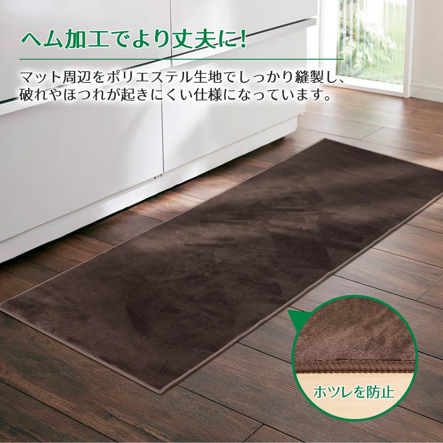 「ロック加工で長持ち・より丈夫に!」使いやすさへのこだわり:マット周囲は丁寧なロック加工が施され、しっかりと補強しています。縁のほつれを防止、キッチンマットを丈夫で長持ちさせることができます。柔軟性があり、小さく丸められる。持ち運びしやすいので、引っ越しの際などに便利。
