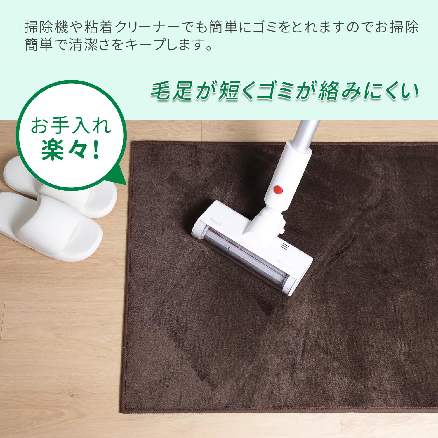 「コロコロだけのお手入れ」ふわふわで柔らかな触り心地が魅力的な素材「フランネル」。短毛なのでゴミが絡まず、細かいなゴミやチリも手軽に除去できます。普段のお掃除はコロコロで十分にキレイにできます。段差がほとんどできない6mmの薄手タイプで、掃除機やルンバが乗り越えられます。シンプルな使い心地でキッチン床面を保護します。