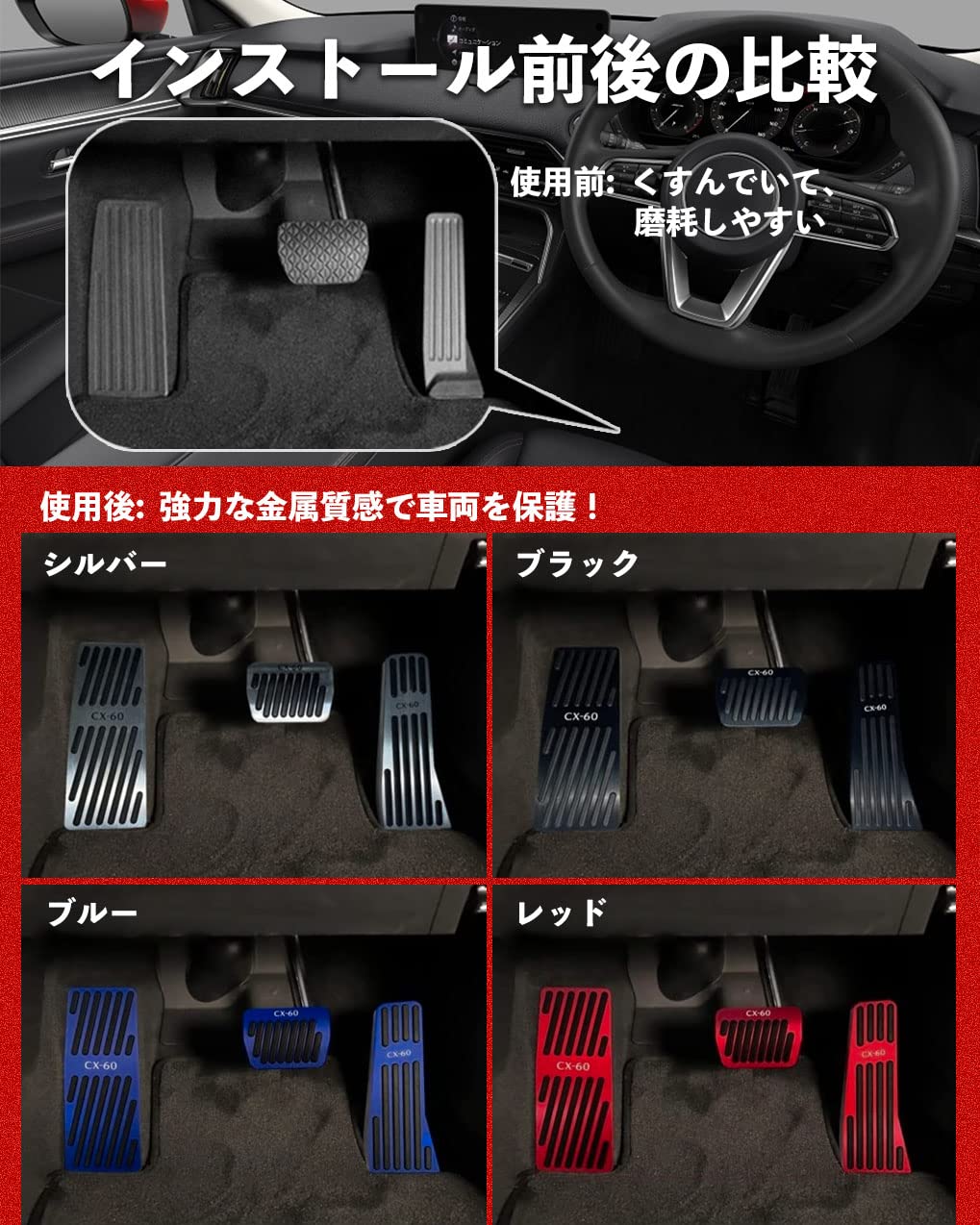 ??【対応車種】:新型CX-60 。ブラック・レッド・シルバー・ブルー全4色。※お車と画像をご確認頂いた上、お買い求めくださいませ。(お使いのブレーキアクセルペダルの形状を必ず確認ください【写真参照】)。