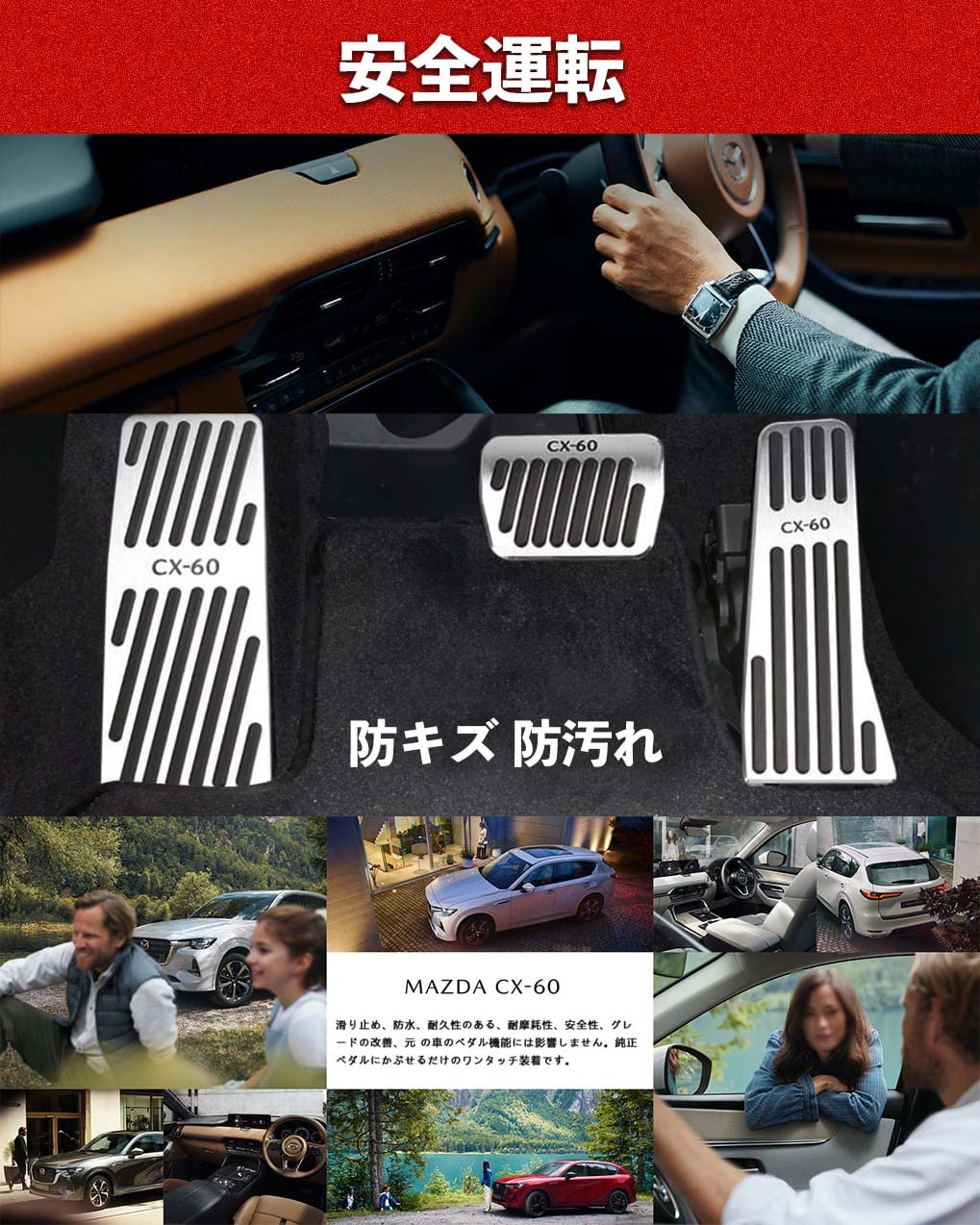 ??【取付方法】:穴をあける必要はなく、工具も必要なく、直接取り付けることができます。1.アクセルペダルは純正ペダルから本製品をかぶせてください2.ブレーキペダルは純正ゴムカバーを外してから取り付けてください。3.マット:CX-60マットは両面テープが付いているので、外して取り付けてください。