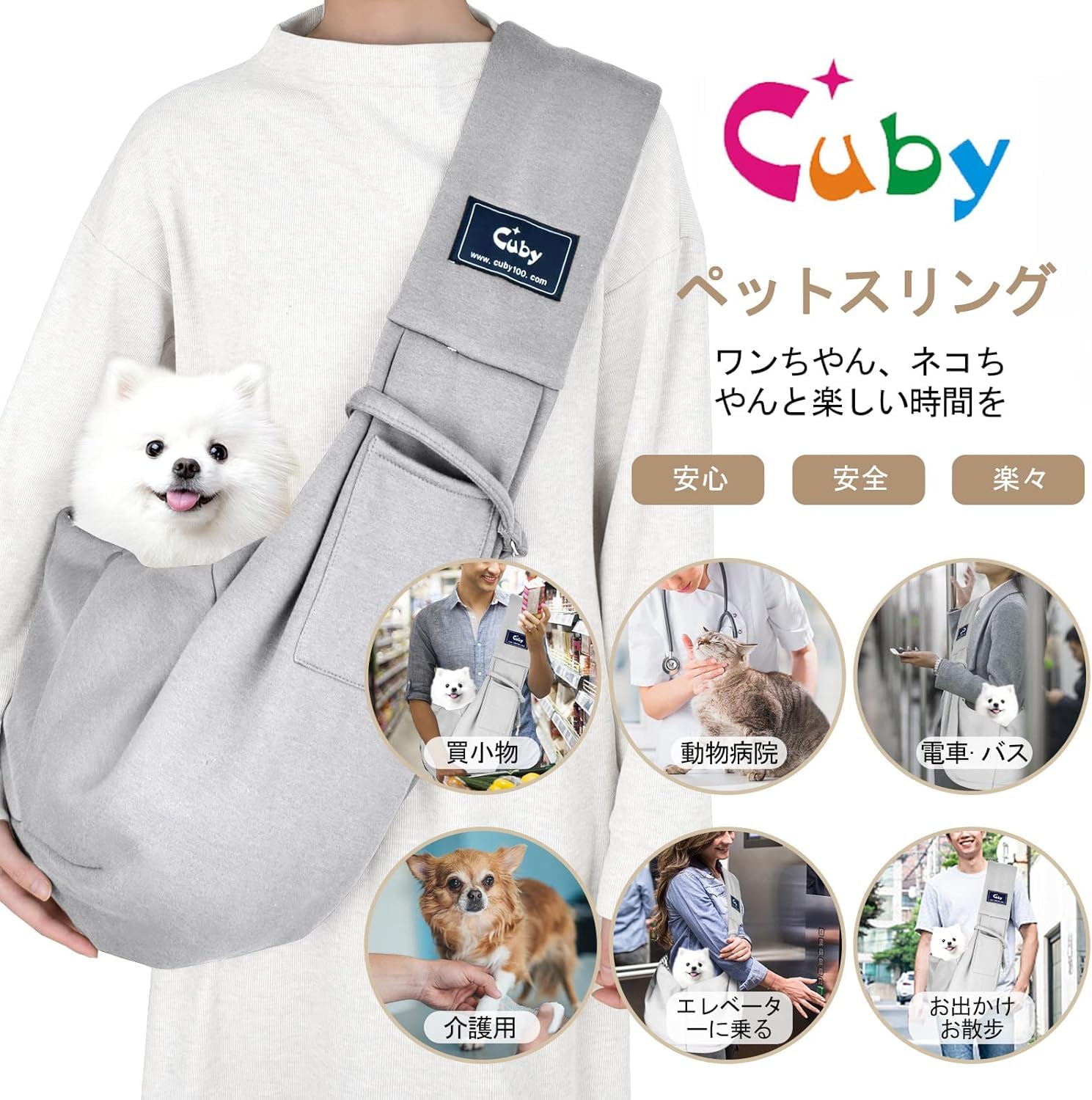 CUBY ペットスリング ペット バッグ 抱っこ紐 犬猫兼用 小型犬 キャリーバッグ 飛び出し防止用ボタン付き 安全フック付き 調節可能 ポケット付き 斜めショルダーバッグ お出かけ抱っこ 6キロまで対応(グレー)