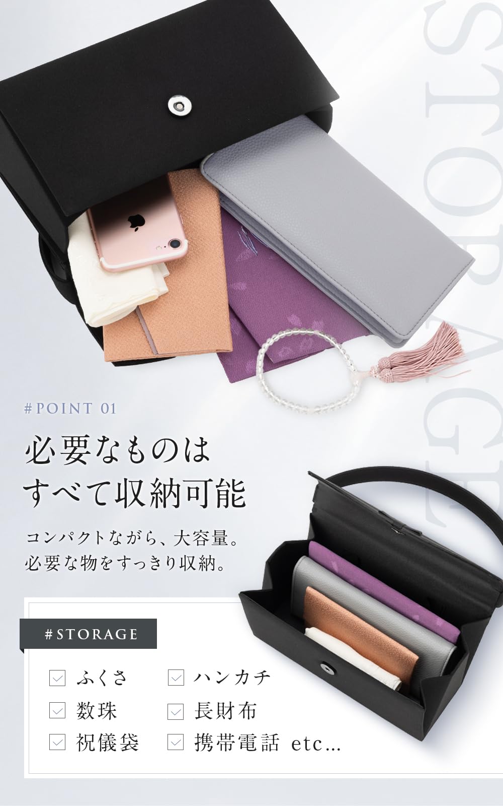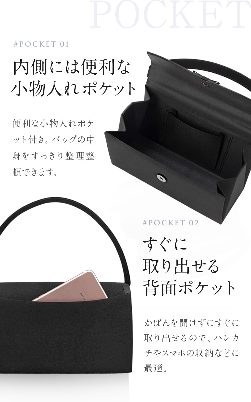 財布・スマホ・ハンカチ・数珠など必要なものは全て収納可能。バッグの内側、外側にそれぞれオープンポケットがあり。開口部が大きく開き、マグネット式なので取り出しもスムーズです。