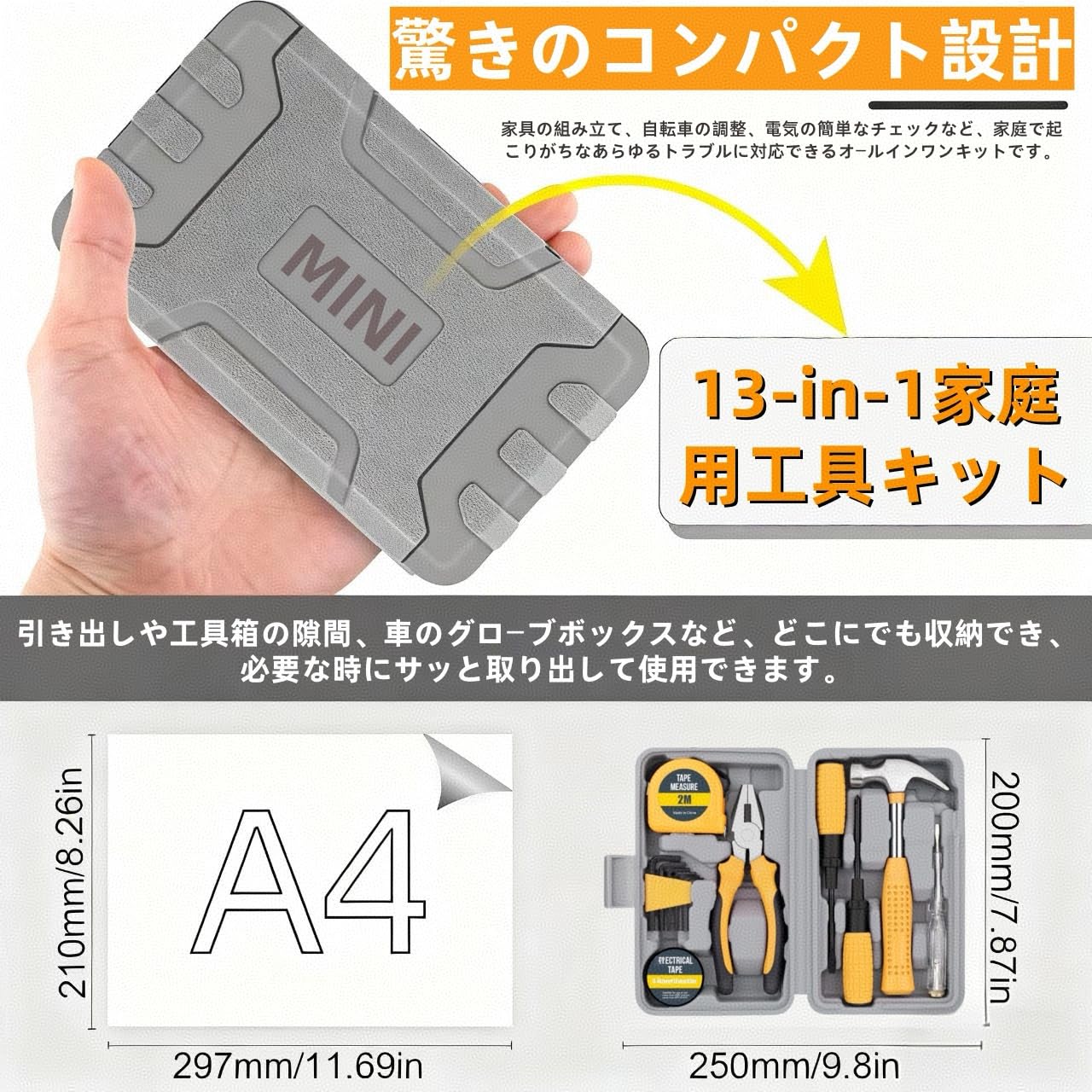 家庭、アパート、大学の寮、または職場用に、その小さくコンパクトなサイズと明るいカラーのトリムは、実用的なDIY修理やメンテナンスにおいて目を引くセットとなっています。いざという時、すぐ手に取って「自分で直せた!」という自信と達成感は、日々の生活をより豊かにしてくれるはずです。
