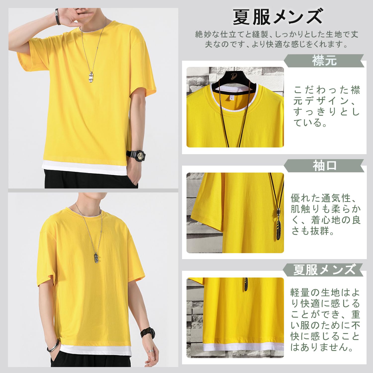 [Mifish] 夏服 メンズ tシャツ 半袖 無地 重ね着風 大きいサイズ ゆったり 五分袖 柔らかい肌触り 涼しい
