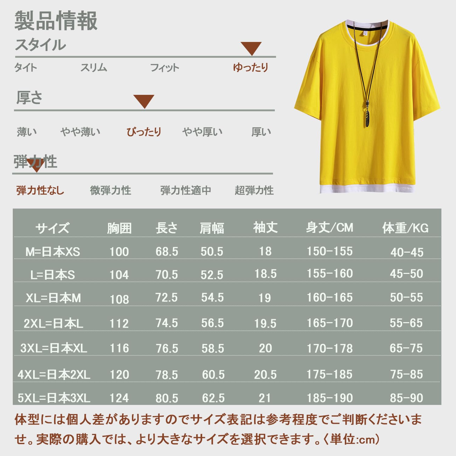 【M】身長:150-155cm 体重:40-45kg;【L】身長:155-160cm 体重:45-50kg;【XL】身長:160-165cm 体重:50-55kg;【2XL】身長:165-170cm 体重:55-65kg;【3XL】身長:170-178cm 体重:65-75kg;【4XL】身長:175-185cm 体重:75-85kg;【5XL】身長:185-190cm 体重:85-90kg;【注意】左の写真のモデルが着用しているネックレスは、服と一緒に出荷されていませんのでご注意ください