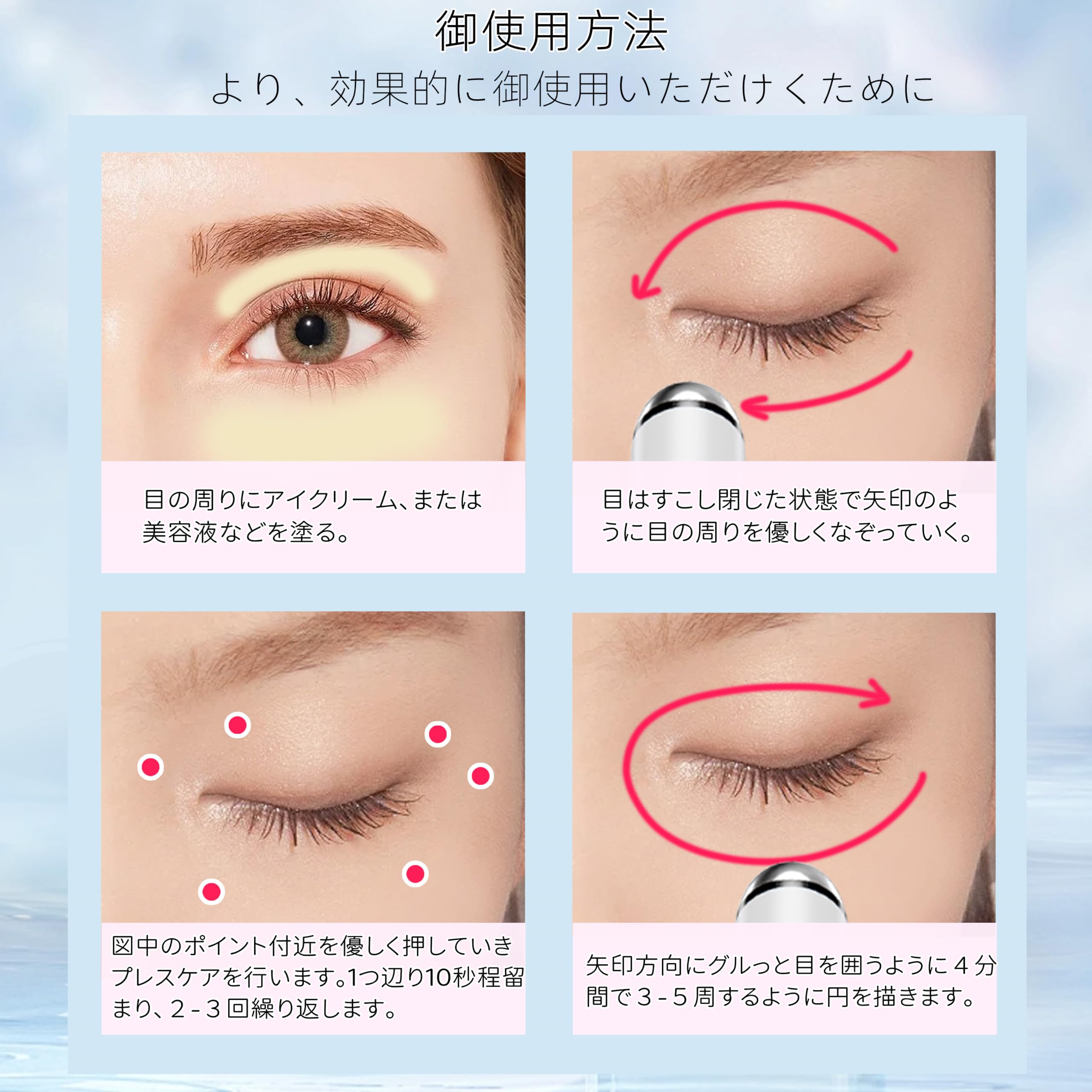 【栄養導入】小さなヘッドが目元&口元の細部にアプローチ。イオン誘導で潤いを与え、美容成分を肌の深層まで浸透させ吸収させ、目もとが輝く美しさへ導きます。
