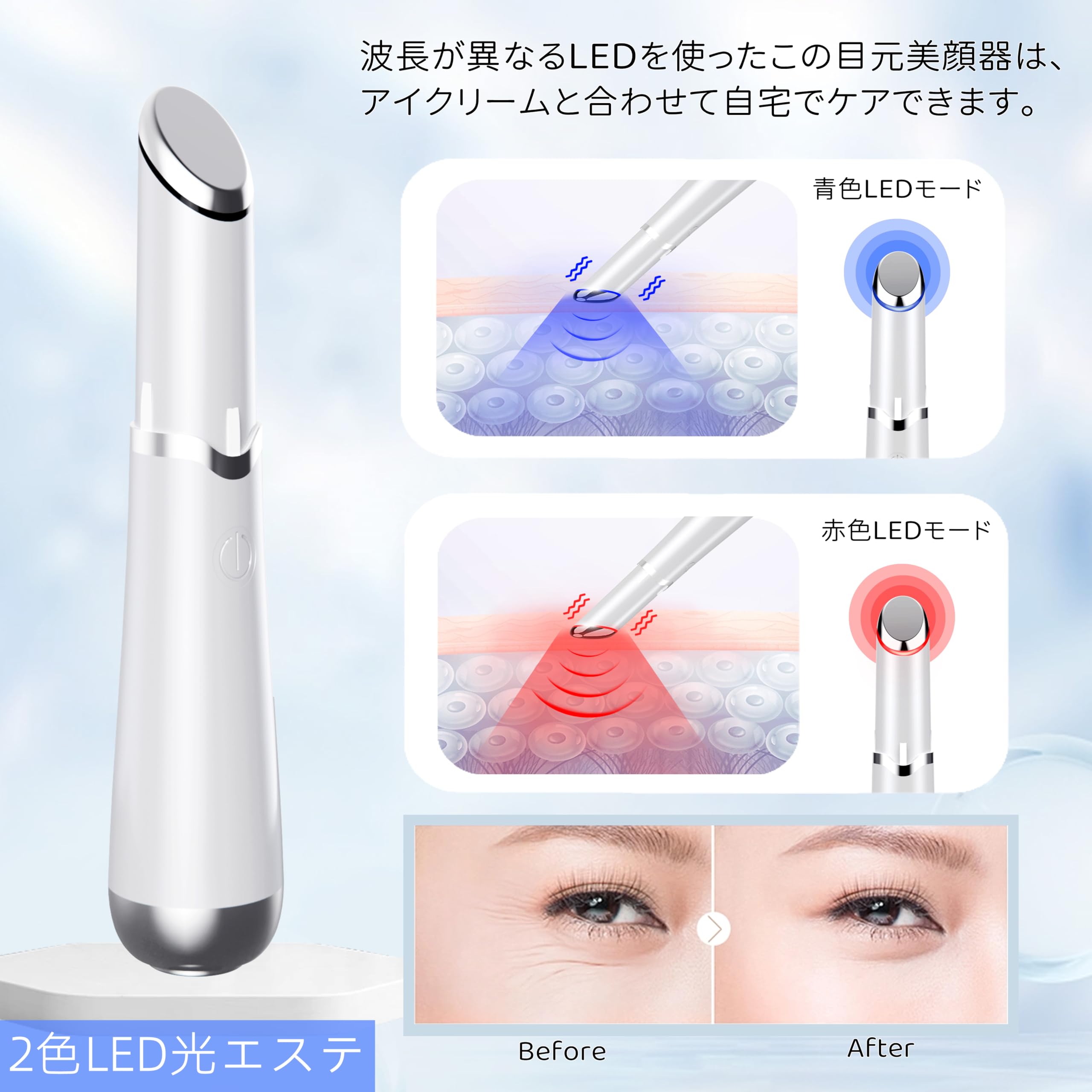 【目元専用美顔器】Rakukurasiの2024年最新目元美顔器は、温熱、音波振動、イオン導入、2色LEDが一体化。デザインと軽さで毎日の美容を格上げ。目元が気になる方や若い方も積極ケアしましょう!
