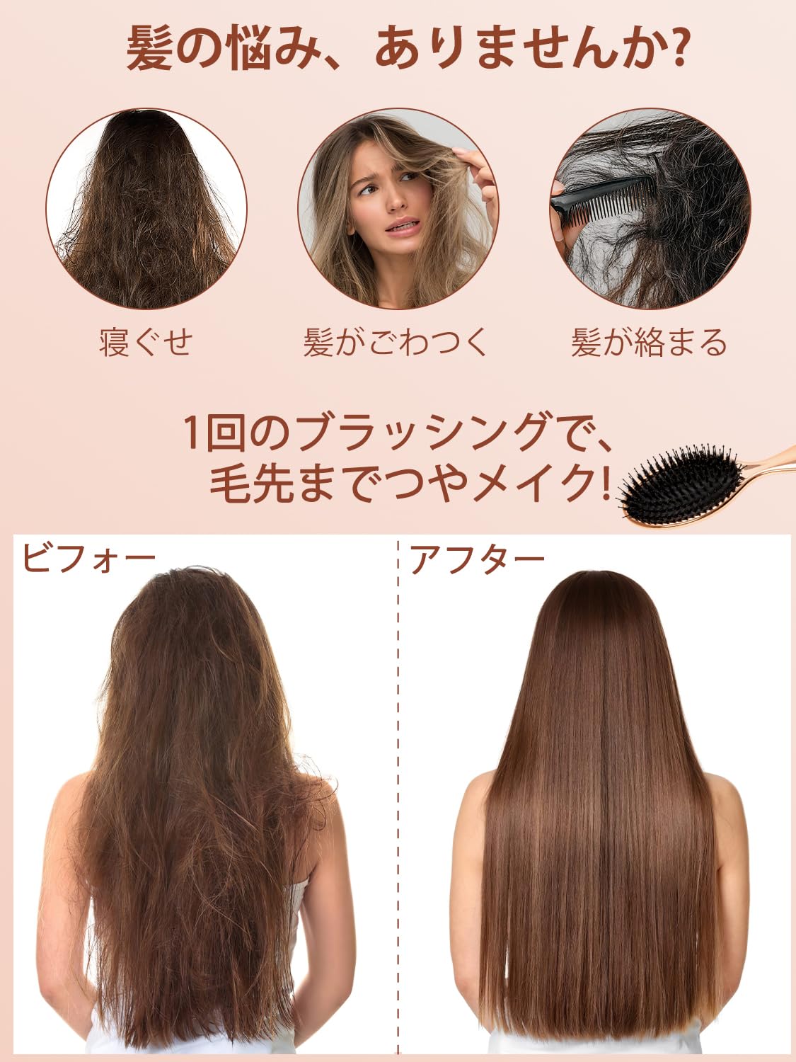 「長短ダブルピンでスムーズに絡まり解消」長いナイロンピンが絡まりをやさしくほぐし、短い猪毛が髪の表面を整えて自然なツヤをプラス。二層構造のブラシがもつれを簡単に取り除き、髪へのダメージを抑えながらスムーズにブラッシングできます