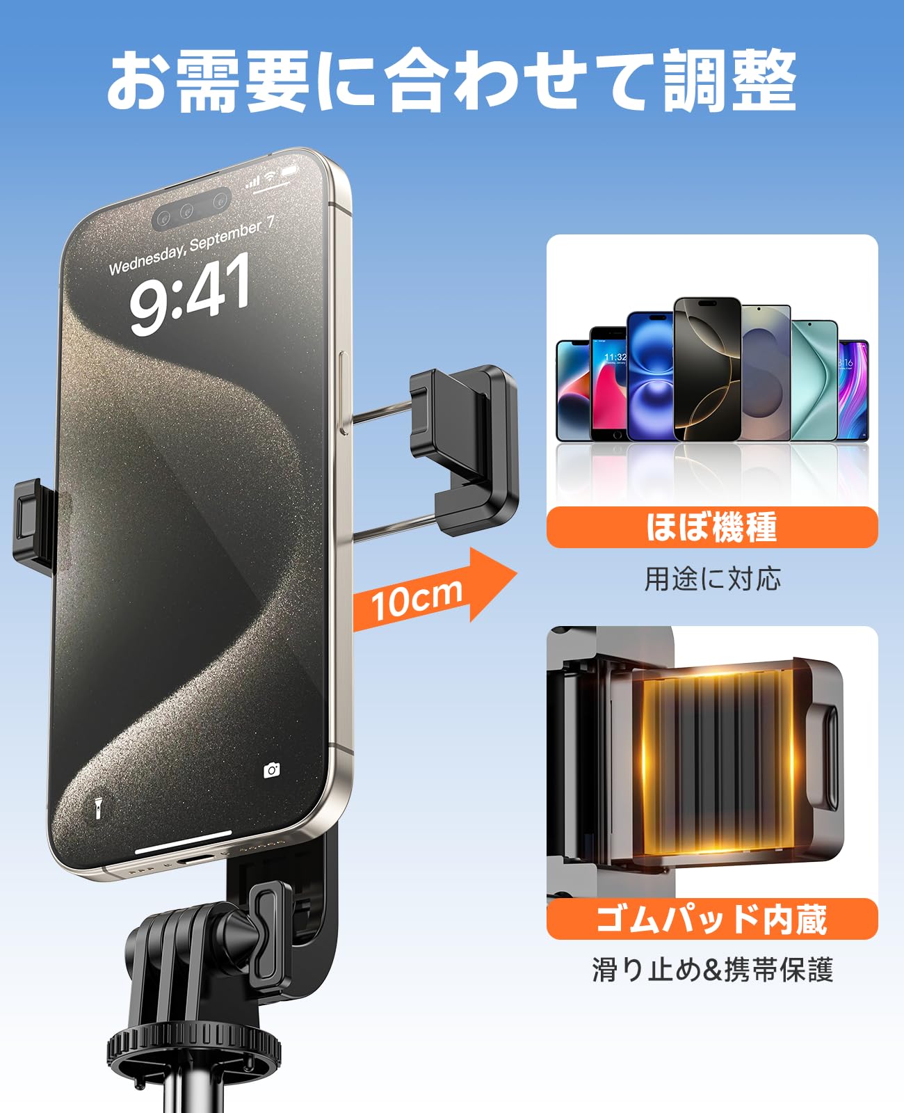 【フリーアングル調整&多シーン対応】 スマホホルダー部分は360°回転可能で上下角度も自由に調整でき、縦/横位置の切り替えが簡単に行えます。精密な角度微調整機能により、Vlog 撮影やライブ配信時に理想的なアングルを簡単に設定できます。手持ち撮影はもちろん、卓上設置や三脚据え置きなど、さまざまなシーンに対応しています。さらに59-91mmの幅広いスマホサイズに対応し、ホルダー内側のゴムクッションにより、スマホをしっかり固定しながらも傷つける心配がありません。